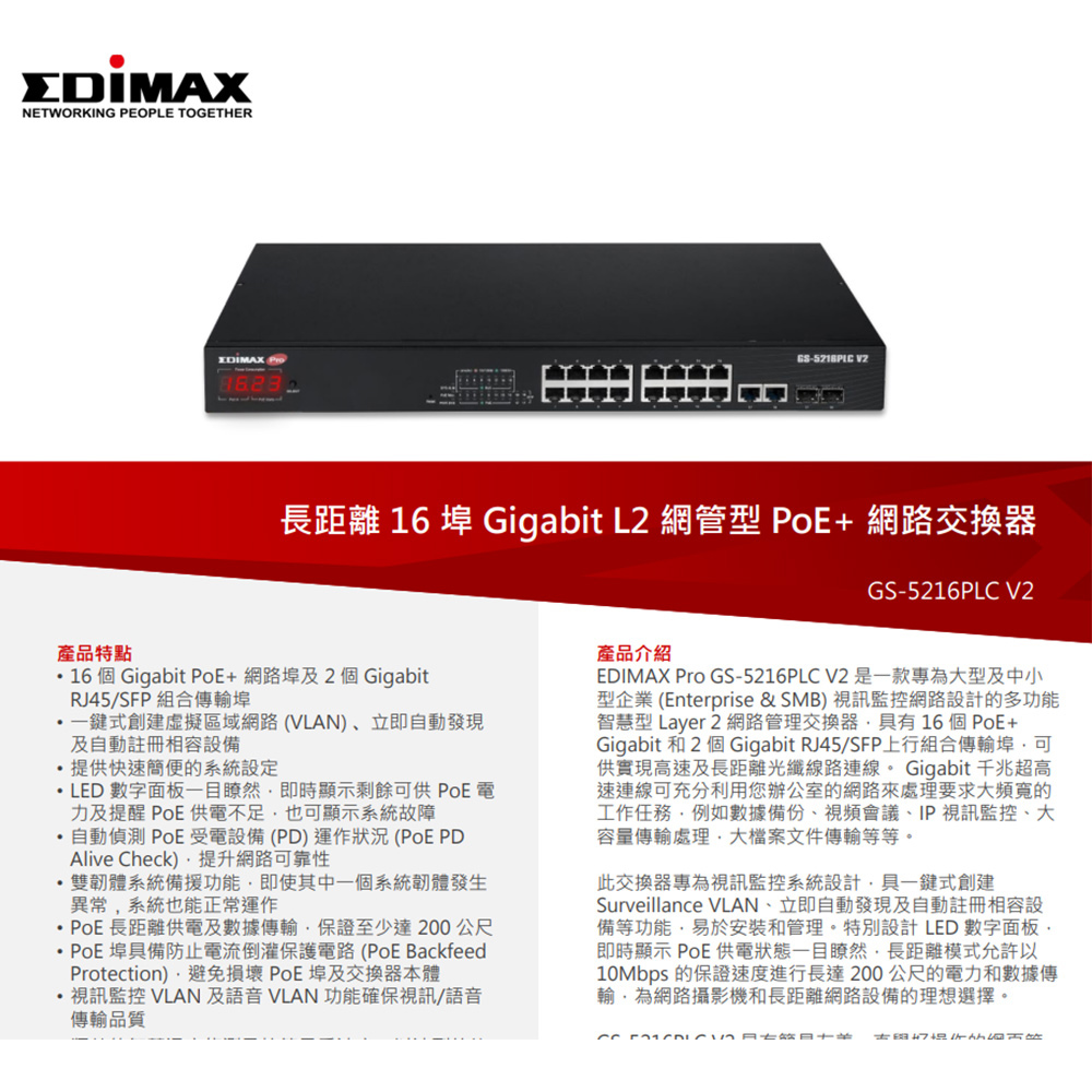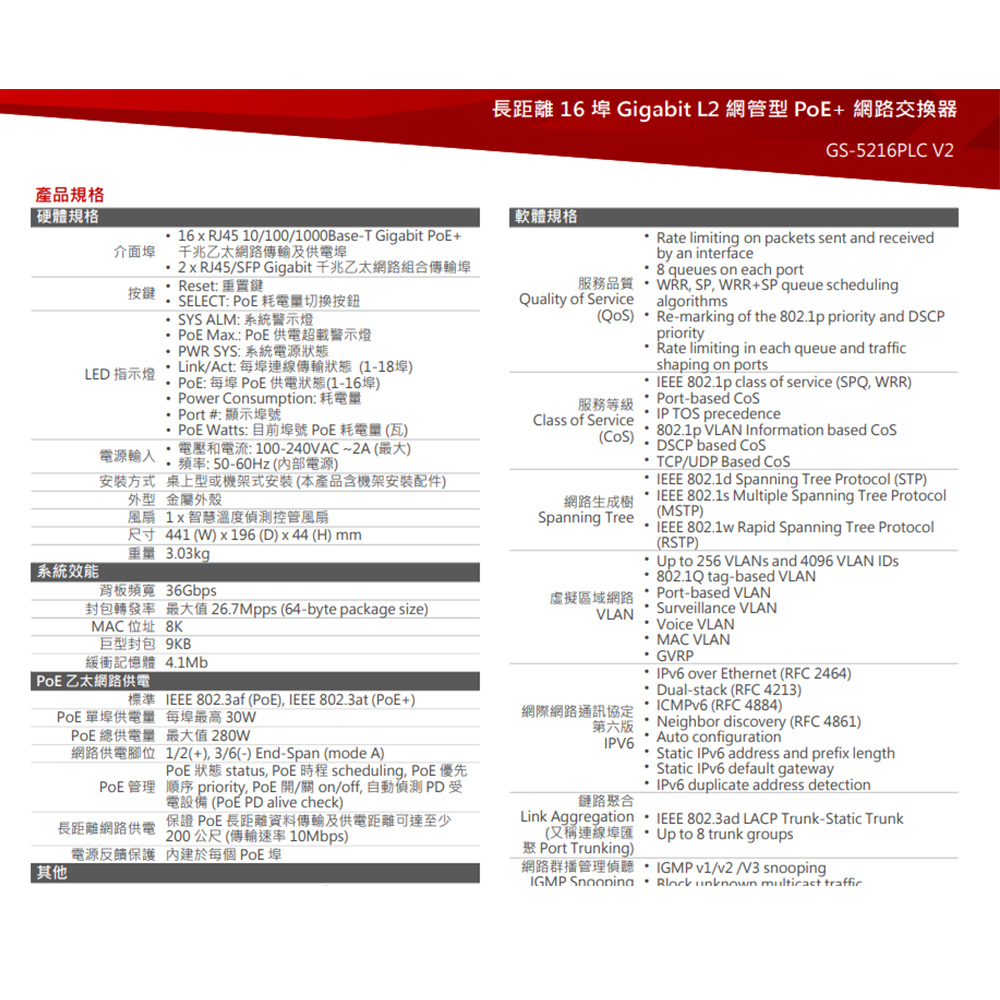 -16個Gigabit PoE+網路埠、2個Gigabit RJ45/SFP組合傳輸埠。