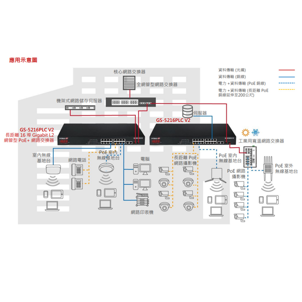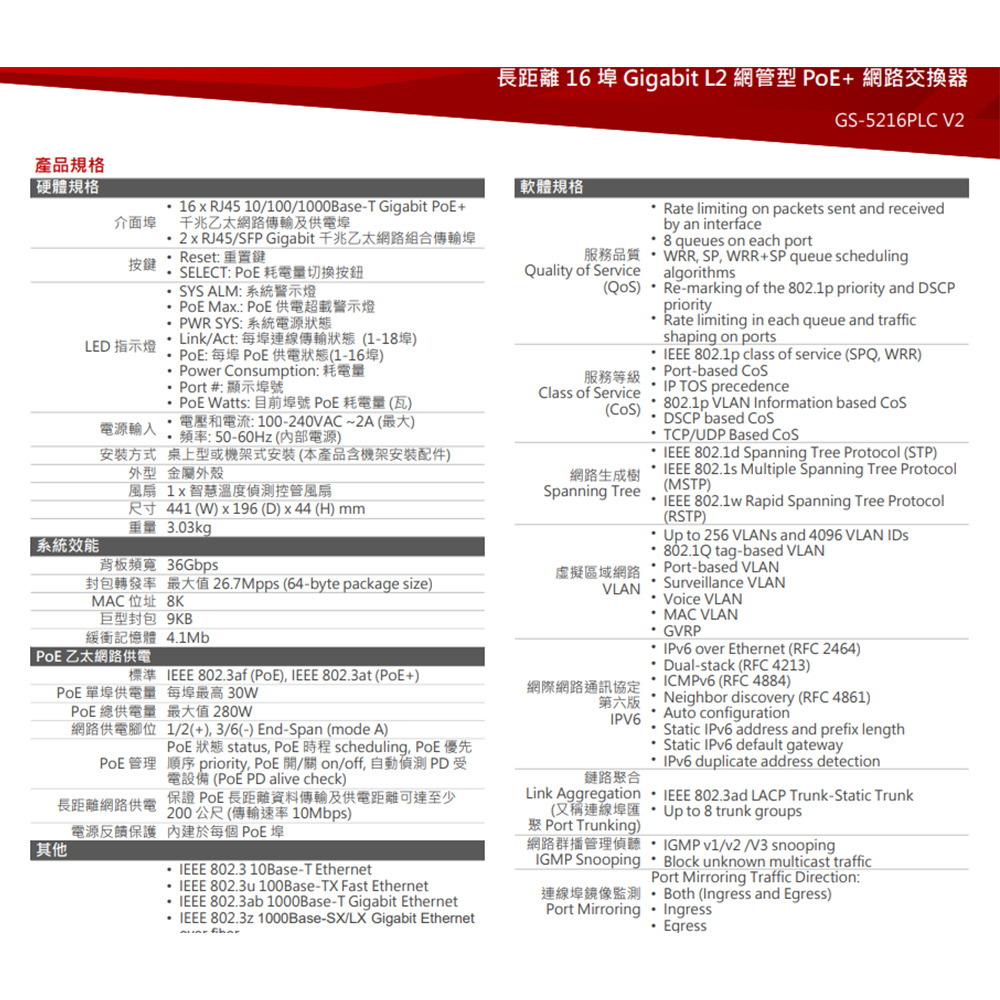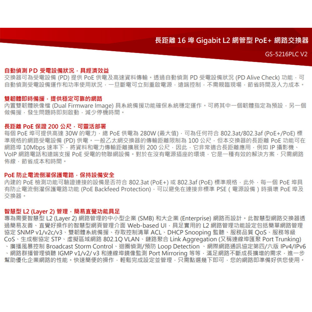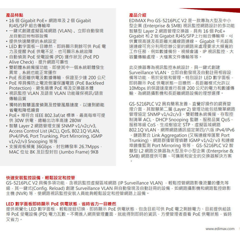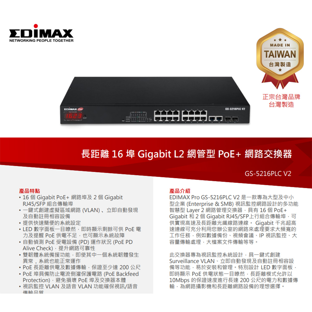 昌運監視器 EDIMAX 訊舟 GS-5216PLC V2 (MIT) 長距離 16埠 L2 網管型 PoE+網路交換器