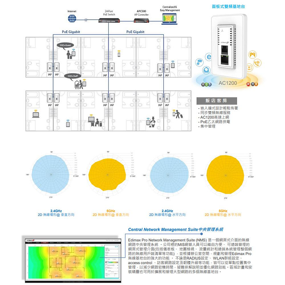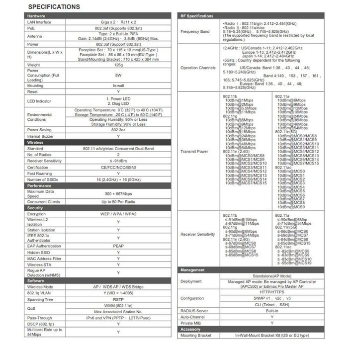 • 採用802.11AC 同步雙頻無線傳輸技術:無線傳輸速率最高可達1200Mbps 。• 安裝簡易:嵌入牆內設計, 無需添購配件即可搭配標準歐規/美規預埋盒,超薄設計能緊貼於牆面, 又不干涉相鄰插座運作。• 電話/網路/WiFi緊密的結合:將11ac無線基地台、Gigabit 網路及RJ-11電話整合在同一設備裡, 又不失效能及穩定性。• 專為高密度使用設計:最高同時承載 100個無線裝置, 人潮眾多環境下, 最理想的無線解決方案。• 多組SSID&VLAN可供網路安全性管理:可支援高達32 組 SSID , 更可針對SSID進行 VLAN 設定讓您的無線網路規畫更彈性及安全。• 支援L2無線隔離保護具備無線網路隔離保護能力, 上網時不必擔心資料傳輸被有心人竊取。• 支援 Fast Roaming 快速漫遊 :能讓基地台與基地台間的無線漫遊不會延遲或中斷,以確保影音串流應用的最佳表現。• 接收靈敏度高,優化無線訊號覆蓋範圍:可隨環境調整 無線輸出功率搭配高接收靈敏度,讓無線訊號覆蓋範圍符合佈建需求, 更不會干擾其他基地台訊號, 尤其適合飯店病房等大量相鄰AP佈放場所。• 支援PoE:支援 IEEE802.3af的 PoE 供電模式• NMS 中央管理系統:搭配 Edimax Pro Network Management Suite (NMS)中央管理系統,直覺式、超簡易網頁式中央管理系統 ,可支援 AParray 架構。• 適用環境 :高效能及高密度用量的最佳選擇。適用飯店,宿舍,住家,機場貴賓室,會議室,教室,餐廳…等。
