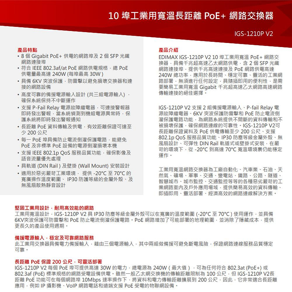昌運監視器 EDIMAX 訊舟 IGS-1210P V2 10埠工業用寬溫長距離PoE+ 網路交換器