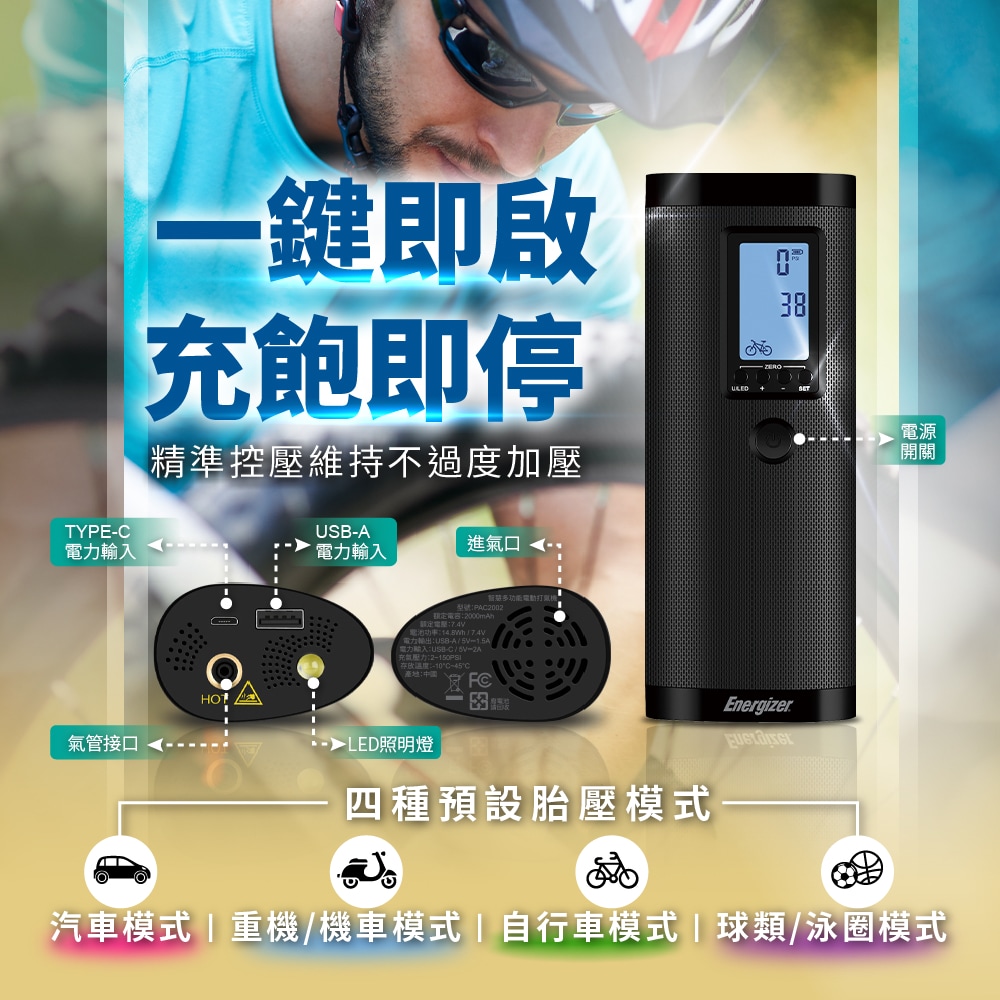 👍五種打氣模式,汽車、機車、自行車、球類(小體積充氣器材)及任意模式均可使用,附有法式氣嘴、球針、泳圈氣嘴、氣球氣嘴。