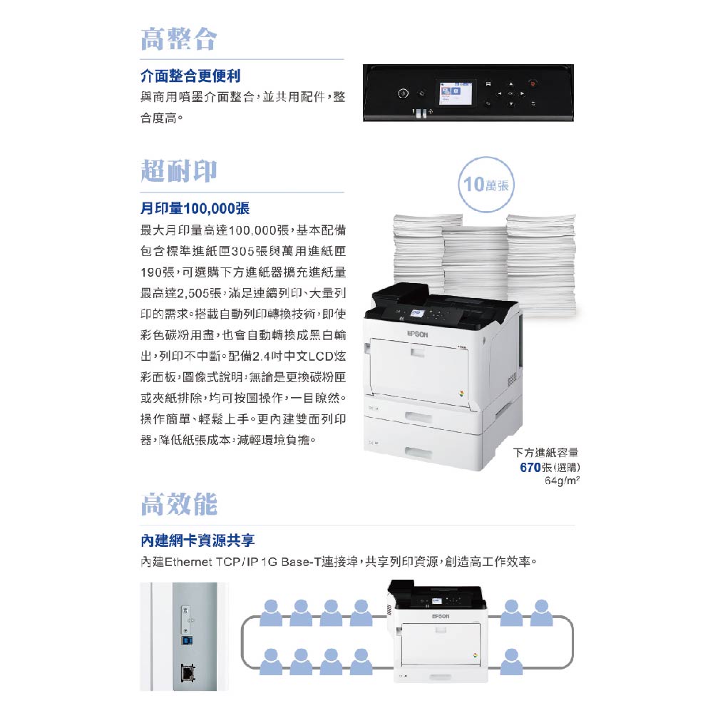內建Ethernet TCP/IP 1G Base-T連接埠,共享列印資源,創造高工作效率