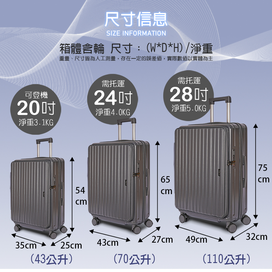 特色:隱藏式杯架、可掛式防磨腳座、PC+ABS耐刮箱體、擴充加大15-30%空間、360度靜音雙排飛機輪(55mm)、TSA國際認證密碼海關鎖、多段鋁合金拉桿、分區拉鏈網袋、X型束帶