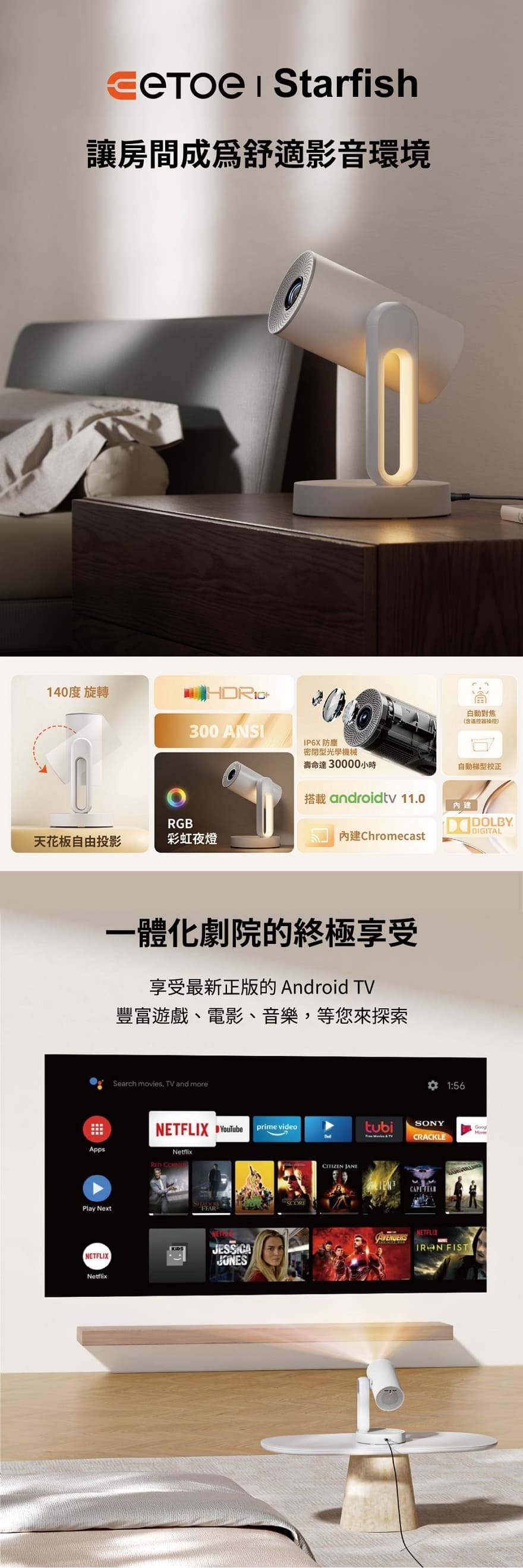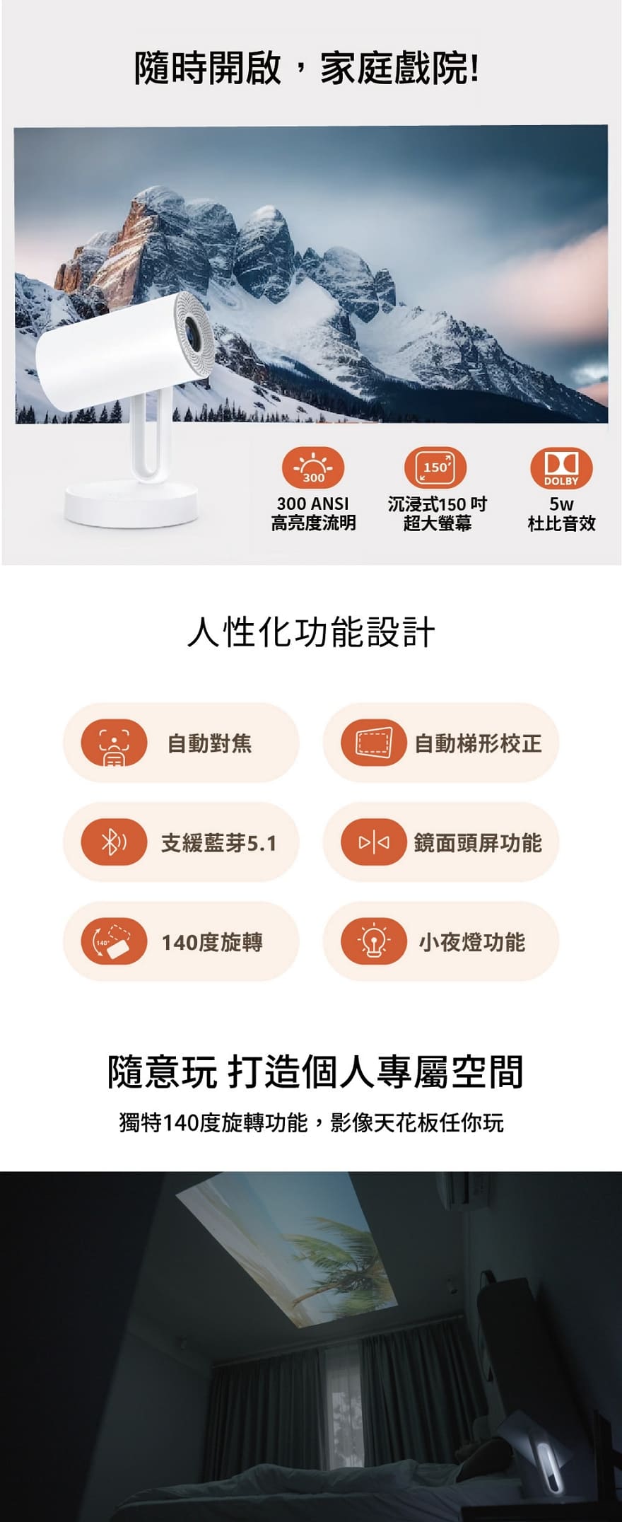 貼心夜燈以及星空功能,把劇院人性化的帶入房間內,讓每個人輕鬆體驗一站式影音娛樂!