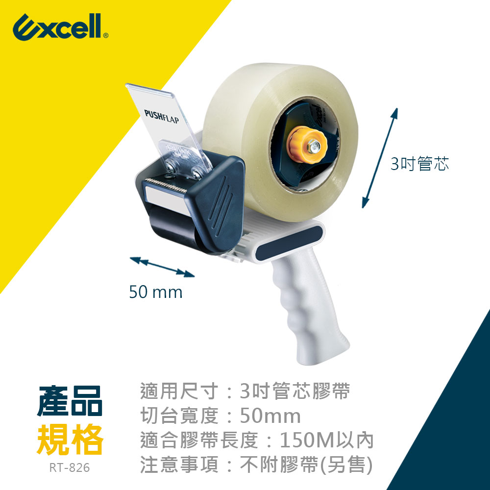 - 品牌:Excell 膠帶切割器 / 握把式封箱切台- 型號:RT-826- 適用尺寸:3吋管芯膠帶- 切台寬度:50mm- 適合膠帶長度:150M以內- 注意事項:本賣場販售單獨切台一只,不附膠帶,刀片不可替換。☆可轉動旋鈕:調整膠帶張力以獲得最佳使用,旋鈕向右旋轉擰緊膠帶,向左旋轉鬆開膠帶,使封箱動作更平順流暢。