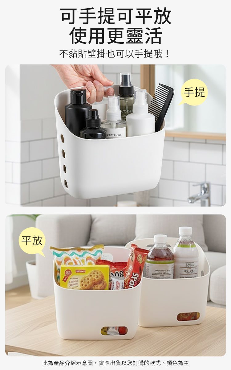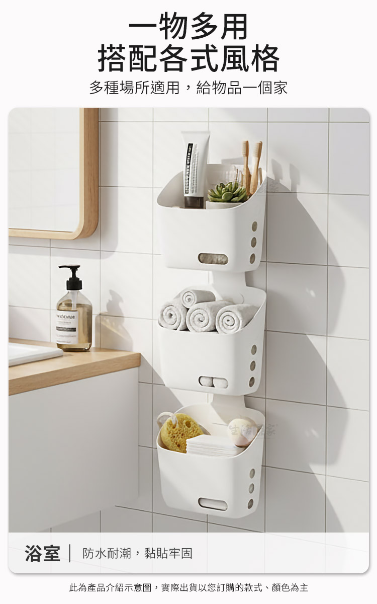 ffcat 強力無痕壁貼掛籃,看得見的整齊感洗手台擠滿了瓶罐?廚房流理台堆放著待處理的洋蔥蒜頭?連臥室裡的小物也總找不到家?空間不夠不是因為東西多,而是因為你沒利用好「牆面」。ffcat 強力無痕壁貼掛籃 是專為追求高效率與質感的你設計,透過系統化的垂直收納,讓凌亂瞬間歸零。🏠🛠️ 零修補免打孔:採用強力無痕貼片,即貼即用,不傷牆面,租屋族也能安心打造專屬收納牆。⛓️ 巧妙垂直串聯:獨創掛勾結構,可無限延伸向下串接。向上發展,節省橫向坪數,讓角落變身黃金收納區。🌬️ 極致通風細節:底部設有精密瀝水孔,側面與正面皆有透氣與識物孔,浴室使用不積水、廚房存放蔬果更保鮮。💪 加厚穩固耐用:視覺可見的加厚材質,耐重不易變形,即使放置沉重的沐浴乳或大顆蔬果依然穩如泰山。🧺 一物多用靈活性:它是掛籃,也是手提籃,更能直接平放於桌面,隨心應對各種生活情境。✅ 使用後你會發現...浴室乾爽了: 瓶罐不再底部發霉,備用毛巾井然有序。🛀環境清爽了: 物品不再放的亂七八糟,通風存放讓空間更整潔。🥕心情舒坦了: 視覺上的整齊直接提升生活品質,找東西不再心煩意亂。✨️ 收納,就是對生活的投資不需要昂貴的裝潢,只要一組 ffcat 強力無痕壁貼掛籃,就能讓家裡煥然一新。現在就開始你的空間革命,把凌亂留給過去,把舒心還給自己!🛒#居家收納 #免打孔收納 #垂直空間利用 #租屋族救星 #收納美學📣 FAQ (常見問答)Q1:無痕貼片會容易掉落嗎?A1:本產品採用高強度防水無痕貼,針對磁磚、玻璃等光滑牆面有極佳抓力,正確黏貼並靜置後非常牢固。Q2:這個掛籃可以承裝重物嗎?A2:產品採用加厚材質,且掛勾結構經過強化,放置大瓶裝沐浴乳、洗髮精或重磅蔬果皆沒問題。Q3:串聯後會不會晃動?A3:掛籃背面設有固定結構,串聯時能保持高度穩定,垂直受力設計確保整體重心平衡。Q4:底部有孔洞,放在臥室裝襪子會漏嗎?A4:底部的瀝水孔細小且分布均勻,收納襪子、內衣或小物等不會掉落,且能保持通風避免異味。Q5:可以更換掛籃的順序嗎?A5:可以的,串聯設計非常靈活,您可以根據使用習慣隨時調整掛籃的層次或單獨拆卸使用。注意事項:1.請確保安裝於乾燥、平整且光滑的表面(如磁磚、玻璃、金屬板)。2.貼上無痕貼片後,建議先靜置 24 小時待膠體完全固化後再掛上籃子。3.雖然材質加厚,但建議不要超過產品設計的額定負重,以維持長久使用。4.可直接用水沖洗或濕布擦拭,請避免使用具腐蝕性的化學清潔劑。5.串聯多組時,請確保最上層的壁貼基座安裝穩固,以分擔整體重量。