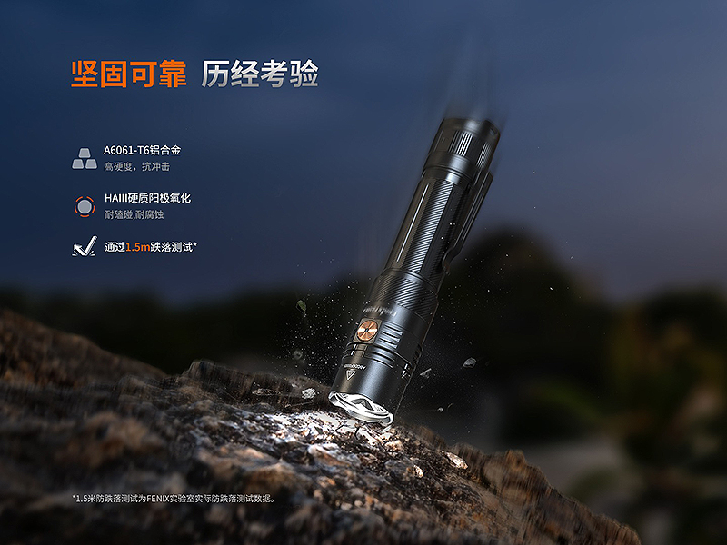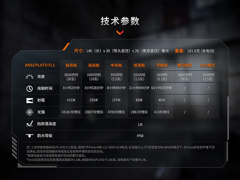 ◎創新SET功能,可適配不同場景需求◎最高亮度達3000流明,最遠射程415米◎使用一顆Luminus SFT70 Gen2 LED,壽命50000小時◎尾部戰術開關設計,一觸即亮,快速回應;頸部按鍵,調光換擋◎標配一節Fenix ARB-L21-5000 V2.0可充電鋰離子電池◎手電筒頸部設有隱藏式Type-C充電介面,即插即充,方便快捷 ◎具有開機電量指示和低壓警示功能◎防滾、防滑的筒身設計,配置抱夾,方便夾持◎恒流電路,亮度恒定◎使用雙面增透膜鋼化玻璃鏡片◎防反接設計,防止電池裝反對電路造成危害◎高強度6061耐氧化鋁材製造,表面HAIII硬質陽極氧化抗磨處理,耐磨抗摔◎尺寸(±10%):146毫米 (長) x30毫米(筒頭直徑)x26毫米(筒身直徑)◎重量(±10%):181.6克 (含電池)