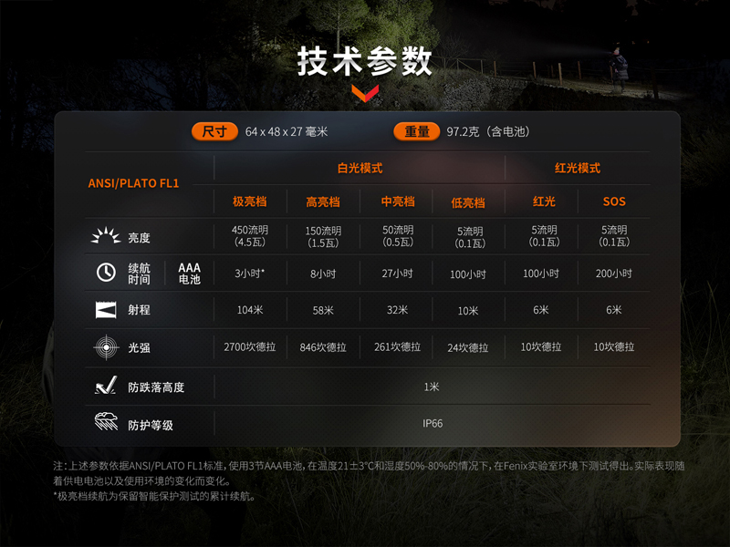◎最高亮度450流明,最遠射程104米◎使用1顆Luminus SST20 白光、2835紅光LED,壽命50000小時◎標配3節AAA(4號)電池,電池易於更換◎紅、白雙光源,滿足多種照明需求◎雙按鍵設計,操作簡單快捷◎60°調節,自由調整照明角度◎加寬鏤空反光頭燈帶,穩固舒適,排汗透氣,安全提示◎電子鎖鍵/解鎖功能,防止誤按點亮◎採用優質PC材質,輕量耐磨◎尺寸(±10%):64(長)x 48(寬)x 27(高)毫米◎重量(±10%):97.2克(含電池)