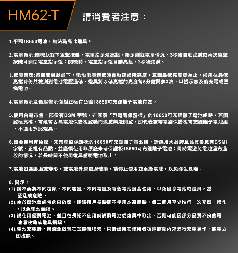 6.如要使用非原廠,未帶電路保護板的18650可充鋰離子電池時,請選用大品牌且品質優良有BSMI字號、正極有凸點,並謹慎使用非原廠未帶保護板18650可充鋰離子電池;同時需避免電池過充過放的情況,若長時間不使用燈具請將電池取出。