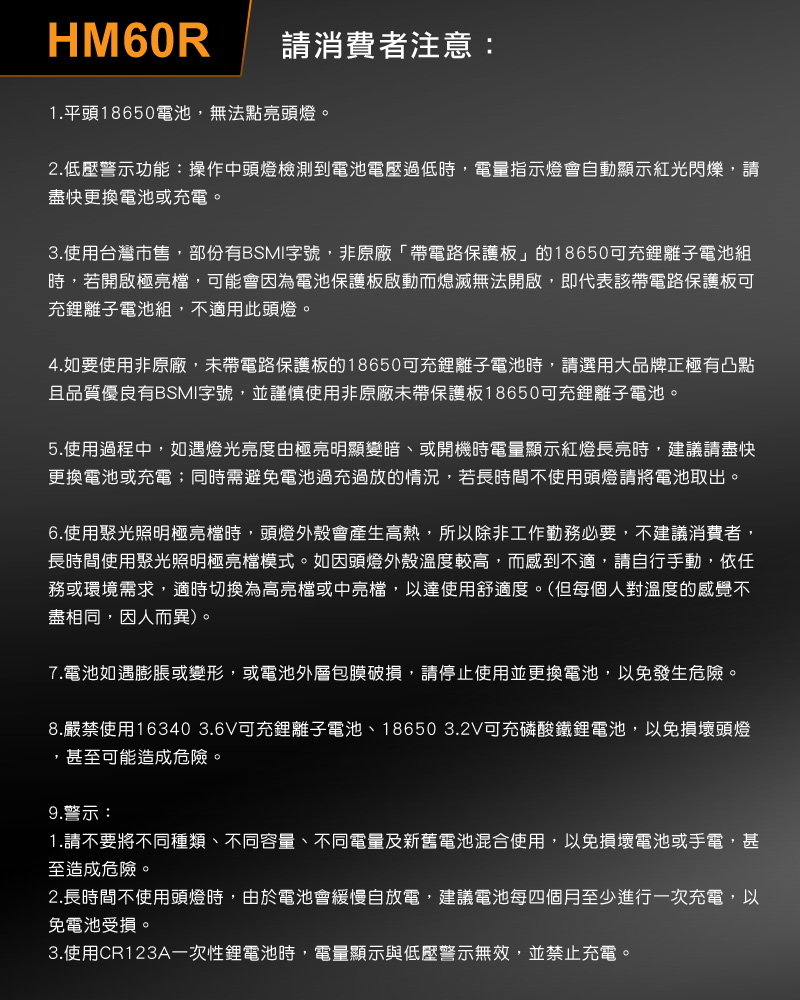 8.嚴禁使用16340 3.6V可充鋰離子電池、18650 3.2V可充磷酸鐵鋰電池,以免損壞頭燈,甚至可能造成危險。