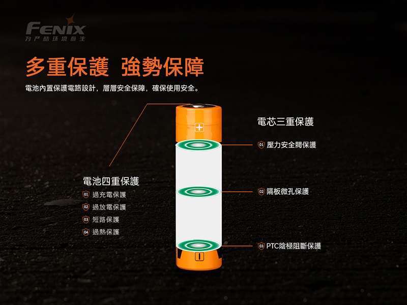 1.ARB-L21-5000 V2.0為FENIX照明產品專用,具充放保護裝置的21700可充式鋰離子電池組,切勿任意拆解、擠壓、打孔、重組裝,或與新舊電池、不同電池混合使用!