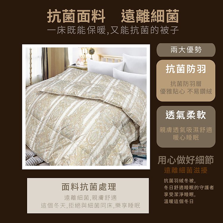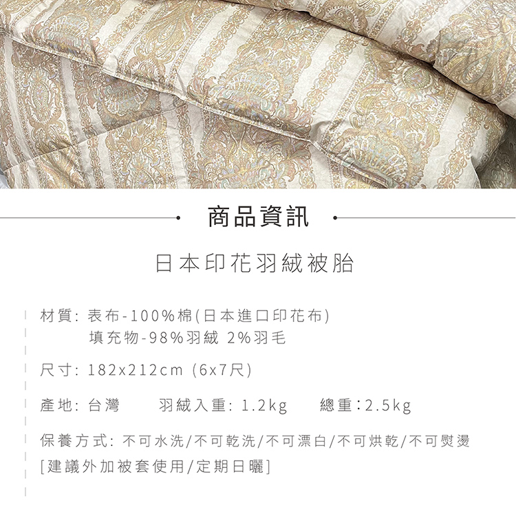 ★羽絨入重:1.2KG★內容件數與尺寸:羽絨被X1件-6x7尺 (182x212cm)★保養說明 :不可水洗╱不可乾洗╱不可漂白╱不可烘乾╱不可熨燙§使用前和收納前,先置於通風處二小時,可以去除放在袋子內的悶味,並保持彈性和蓬鬆度,並延長使用壽命。