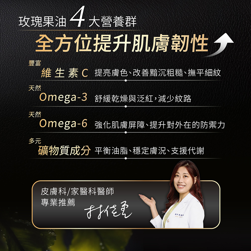 產品功效:強化屏障、滋潤補水、修護調理產品特色:法國皇室御用【玫瑰果油】搭配兩倍高濃度深海巨藻萃取,採用特殊專利技術濃縮三重植萃精華,一滴強效增強肌膚保護力高達50%以上。