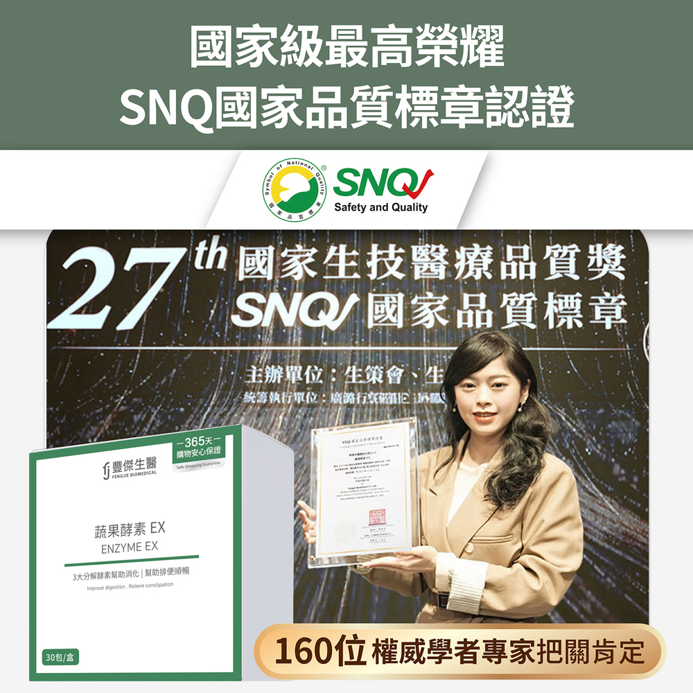 ➤榮獲SNQ國家品質標章、A.A.無添加1星驗證、國家品質金牌獎➤每日1包,飯後或睡前食用較佳➤北部知名醫學大學實驗證實3週改變細菌叢生態➤業界領先,膳食纖維高達33%,幫助排便順暢➤9項歐美日韓專利配方、美國FDA-GRAS成分認證➤Fibryxa專利膳食纖維可促進腸道蠕動➤大豆發酵物、益生元、酵素幫助維持消化道機能➤複方GABA添加,特殊生物活性功能氨基酸,幫助入睡➤全台少有嚴格把關、純天然萃取,不含任何瀉藥成分➤100%全素可食Q1:蔬果酵素怎麼吃?晚餐飯後搭配一杯150-250c.c.的水攪拌食用,水溫勿超過40度,味道為酸甜莓果味~若無幫助入睡調理需求,也可以在任一餐後食用。Q2:酵素可以跟其他產品同時食用嗎?豐傑生醫建議任何產品都不要同時食用喔,因為成分有可能會互相影響,建議間隔30分鐘再食用。Q3:孕婦可以食用蔬果酵素嗎?當然可以,所有人都可以食用。孕婦、哺乳期間也能安心食用。Q4:酵素可以跟益生菌一起吃嗎?可以的!益生菌主要是幫助調整體質、改變細菌叢生態,而蔬果酵素主成分含有專利膳食纖維,不僅可以使排便順暢,同時也是益生菌的食物來源,幫助維持消化道機能更實在。Q5:誰適合食用蔬果酵素EX?不論男女都可以食用!添加專利Fibryxa膳食纖維、大豆發酵物以及洋車前子、決明子、蒟蒻等天然纖維成分,特別推薦給想使排便順暢的人。而GABA則是可以幫助調整體質,幫助入睡!Q6:蔬果酵素EX吃多久會有效呢?保健品並非藥品,建議持續食用七天以上!根據每個人的食用習慣與體質,調理時間也會不同喔!Q7:新版酵素跟以前有什麼不一樣呢?在過去兩年間,我們不斷優化舊版酵素配方,除了提升蔬果的豐富度,還增加了膳食纖維含量,達成了黃金比例的雙效膳食纖維配方。為了提供顧客更大的安心保障,進行了酵素活性與膳食纖維含量檢測。結果顯示,酵素活性不僅高於原料數據,每包酵素更含有「高達33%的膳食纖維」,促進腸道蠕動、幫助排便順暢。最重要的是,我們的蔬果酵素EX不含任何瀉藥成分,不同於市面上許多含有瀉藥成分的酵素,讓你享受純淨的配方,食用更安心。此外,還特別委託專業機構,進行菌相實驗,並且通過SNQ國家品質標章認證,讓產品的有感度與安心度更加卓越。Q8:蔬果酵素有含瀉藥、減肥藥嗎?所有酵素皆經台美檢驗合格。不含瀉藥、減肥藥、西藥成分,請安心食用。Q9:請問可以加進飲料食用嗎?可以的!但碳酸飲料及奶製品不建議。Q10:請問168斷食期間該怎麼吃比較好?可以自由搭配一天中的最後一餐,如果斷食24小時,可以等開始進食後再搭配酵素喔!-------------------------------------------------------------【食用方式】每日飯後日常保養1包,加強調理2-3包,配合150-250c.c.常溫水沖泡飲用,水溫不宜超過40℃。【產品功效】使排便順暢、幫助維持消化道機能、促進新陳代謝、擁有多國專利認證。榮獲2023歐洲品質評鑑大賞、9項歐美日韓專利配方、美國FDA-GRAS成分認證、不含瀉藥成分,安心使用【商品規格】容量規格: 5g/包、 30包/盒保存期限: 2年貨源: 公司貨產地: MIT劑型:粉末【注意事項】1. 補充保健食品期間,每日飲水量需充足(建議: 每公斤體重*35-40c.c.)。2.本品含有大豆、乳糖及其製品,對前述成分過敏者請勿食用。3. 請配合足量水一起食用,對(洋)車前子過敏者請勿食用。4.使用本產品應避免同時飲酒或服用降血壓、鎮靜及癲癇等藥物;孕婦、授乳者、嬰幼兒,須諮詢醫師、營養師方可使用。5.為保持產品最佳品質,開封後仍需密封保存,請於1個月內儘速食用完畢。