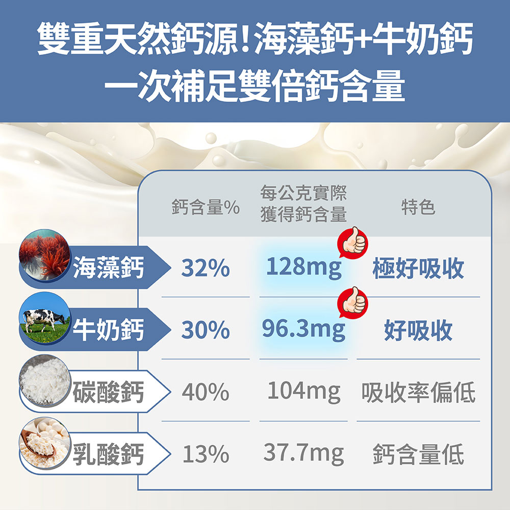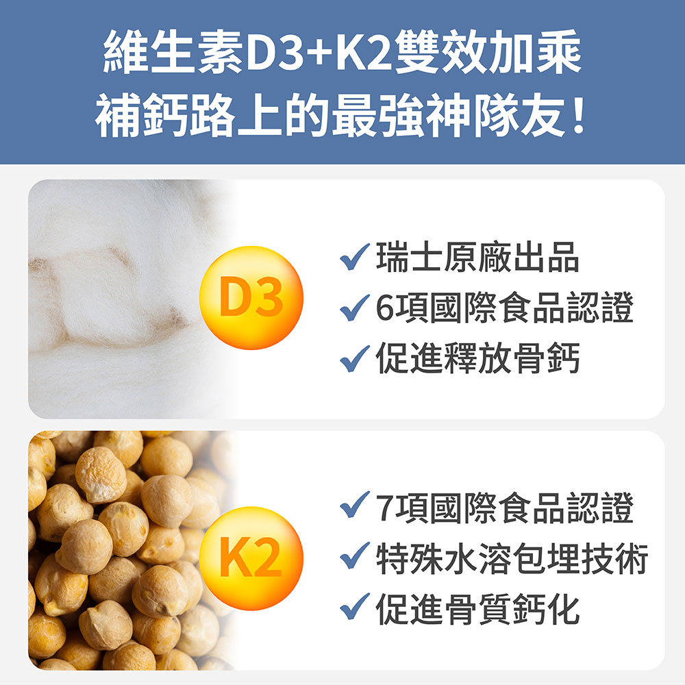 紅藻鈣、牛奶鈣、酪蛋白水解物、海水抽出物(氧化鎂、羧甲基纖維素鈉)、二氧化矽、維生素D3(修飾澱粉(辛烯基丁二酸鈉澱粉)、蔗糖、維生素C(抗氧化劑)、中鏈三酸甘油酯、二氧化矽、維生素E(抗氧化劑)、維生素D3)、鷹嘴豆發酵萃取物(阿拉伯膠、蔗糖、鷹嘴豆發酵萃取物(含維生素K2-7))