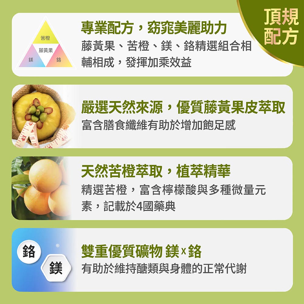 藤黃果萃取物、苦橙萃取物、鉻酵母(非活性酵母、三氯化鉻)、葡萄糖酸鎂、 二氧化矽、硬脂酸鎂。