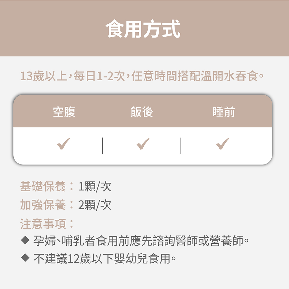 13歲以上,每日1-2次,基礎保養每次1顆,加強保養每次2顆,任意時間搭配溫開水吞食。
