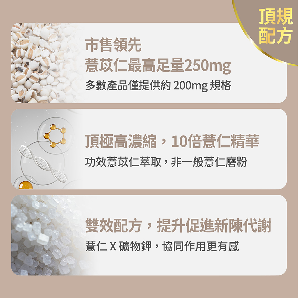 薏苡仁萃取物(薏苡仁萃取物、麥芽糊精)、微結晶狀α-纖維素、硬脂酸鎂、 氯化鉀、二氧化矽。