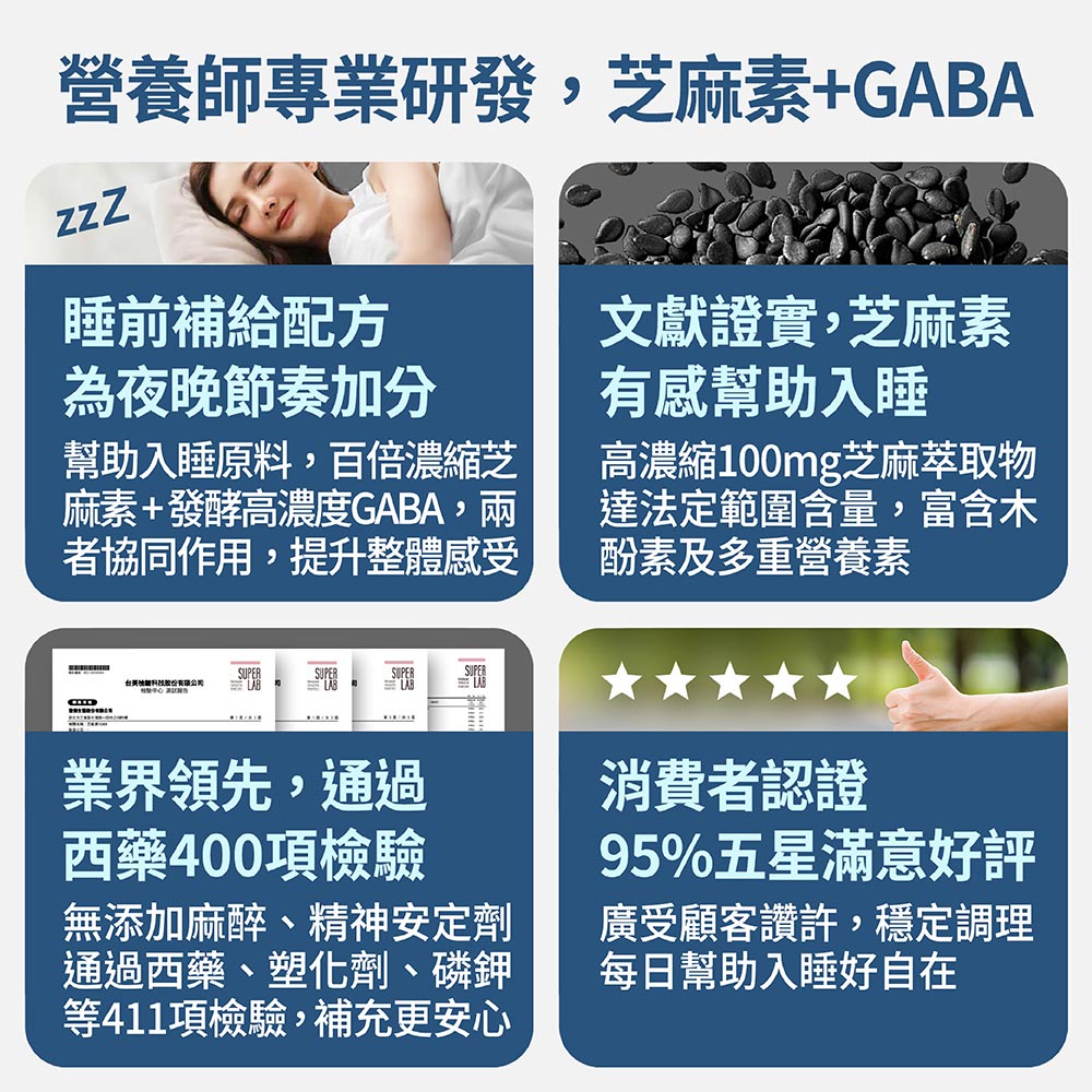 Q1.芝麻素+GABA吃多少?一般日常1顆/天,加強2顆/天,若特殊需求需再加強可3顆/天。Q2.孕婦和小孩可以補充芝麻素+GABA嗎?每個孕婦及小孩的狀況不同,不建議自行補充,若有需求請先諮詢醫師或營養師。Q3.有哪些人不能使用芝麻素+GABA嗎?芝麻過敏者不建議使用,特殊疾病如肝腎臟疾病、痛風,以及服用鎮靜安眠、抗憂鬱等藥物,不建議自行補充,需先諮詢醫師或營養師。Q4.長期使用芝麻素+GABA會有依賴性?芝麻素+GABA的成分多為植萃來源,配方劑量安全,為溫和複方營養素,因此無任何依賴性,可安心使用。Q5.色胺酸、穀維素、酸棗仁分別是什麼?色胺酸:是必須胺基酸之一,人體無法自行合成,須從食物攝取,能促進新陳代謝。 穀維素:穀維素存在於糙米、胚芽的米糠中,含量稀少,多與GABA搭配,做成幫助入睡保健食品。 酸棗仁:常見的中華植萃,能做成酸棗仁湯、酸棗仁茶,成分溫和,多數人會在睡前飲用、幫助入睡。Q6.芝麻素什麼時候吃最好?建議在睡前1小時食用,並搭配溫開水最好喔。-------------------------------------------------------------【使用方式】13歲以上日常保養每日1顆,加強保養2顆;睡前1小時搭配溫開水使用。【產品功效】幫助入睡、維持健康獨特中西合璧配方, 調節生理機能、幸福因子色胺酸,促進新陳代謝、東方睡果酸棗仁,幫助入睡、日本米糠精華穀維素,調節生理機能【產品特點】✔ 每天1-2顆,於睡前1小時使用✔ 採用專利GABA,幫助入睡✔ 八穀之冠的芝麻素幫助調理✔ 搭配獨特中西合璧配方✔ 精選幸福營養因子色胺酸✔ 東方睡果酸棗仁,幫助入睡✔ 日本米糠精華穀維素,調節生理機能【主要成分】L-色胺酸、芝麻萃取物(含芝麻素)、麩胺酸發酵物(含GABA)、微結晶狀α-纖維素、酸棗仁萃取物、γ-穀維素、二氧化矽【商品規格】容量規格: 500毫克/顆;30顆/袋保存期限: 3年貨源: 公司貨產地: MIT劑型:膠囊【注意事項】1.本產品含有芝麻及其製品,不適合其過敏體質者食用。2.兒童及特殊疾病患者,食用前請諮詢醫師或營養師。