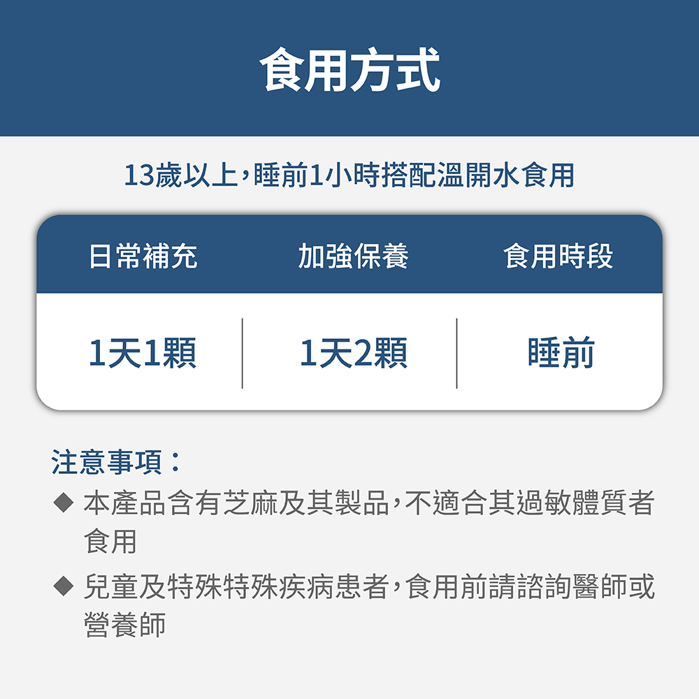 ➤ 每天1-2顆,於睡前1小時使用