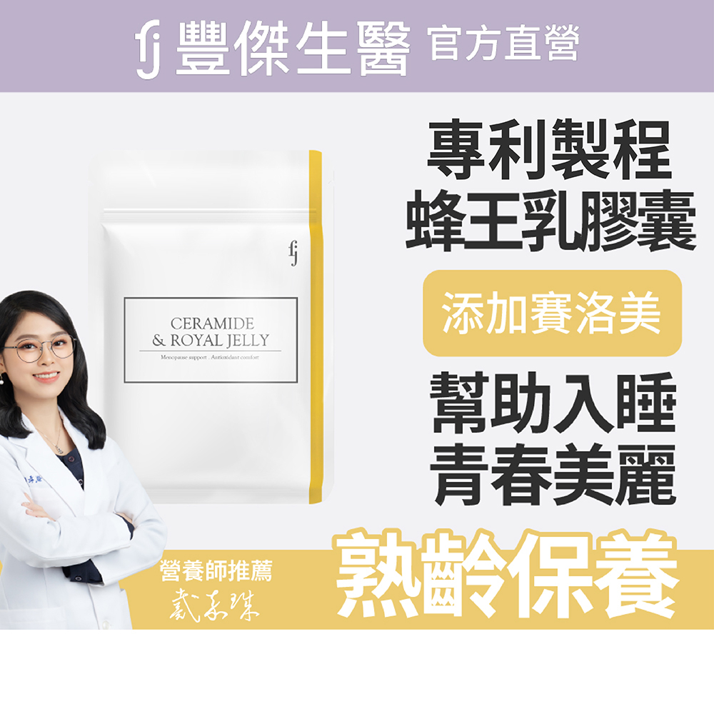 Q1.神經醯胺+專利蜂王乳怎麼吃?日常保養每日2顆,加強保養4顆,任一時間搭配溫開水食用。Q2.孕哺媽咪跟小孩可以吃神經醯胺+專利蜂王乳嗎?因為蜂王乳本身內含類荷爾蒙成分,因此不建議孕婦、哺乳媽媽、18歲以下(尚未青春期)小孩食用。Q3.蜂王乳的好處與營養價值?蜂王乳本身富含多種營養素,其中的類荷爾蒙及癸烯酸為主要營養物質,FJ豐傑生醫蜂王乳採用的更是目前頂尖高規濃度的癸烯酸,幫助調整體質。Q4.素食可以食用神經醯胺+專利蜂王乳嗎?神經醯胺+專利蜂王乳膠囊的膠囊殼屬於動物膠質成分,且蜂王乳取自於天然蜜蜂培養來源,其他成分皆為天然植粹來源,素食者可以自行評估,可以接受的話 可以打開膠囊食用神經醯胺+專利蜂王乳粉末。Q5.除了孕哺媽咪跟小孩,還有誰不能吃嗎?因為蜂王乳本身內含類荷爾蒙成分,不建議生理期期間以及預產期剩一個月,患有婦科疾病、患有乳癌或家族有乳癌病史的女性、對女性荷爾蒙作用較敏感的女性不建議食用。Q6.為什麼要加海藻鈣?海藻鈣屬於天然海洋萃取來源,與蜂王乳搭配效果更升級,也有助於神經的感應性。Q7.請問什麼樣的人適合食用神經醯胺+專利蜂王乳?神經醯胺+專利蜂王乳專門設計給熟齡保養,若是提早想要幫助養顏美容、幫助入睡、調節生理機能、調整體質也很適合使用喔!適合沒有特殊疾病者食用,以保養身體,健康維持。Q8.神經醯胺+專利蜂王乳的功效物質為何?蜂王乳本身包含維生素B群、泛酸 、乙醯膽鹼、類唾液腺荷爾蒙以及癸烯酸;而其中的配方也包含神經醯胺、 維生素E、芝麻素等功效物質喔!Q9.蜂王乳,蜂蜜及蜂膠的區別?三者的製作過程和用途完全不同。蜂王乳是以花粉為主食的工蜂的分泌物, 是含有豐富營養素的蜂王主食;蜂蜜主要是花蜜組成,花蜜是植物花内蜜腺的分泌物,是工蜂的主食。 蜂膠是蜜蜂用從植物幼芽與樹幹上採集的樹脂,並混入它的上顎腺分泌物和蜂蠟等加工而成的一種具有芳香物質,主要作用為保持蜂巢清潔。Q10.蜂王乳男人可以吃嗎?可以的,蜂王乳的多種成分對男性也是不可缺少的重要營養素,可促進新陳代謝。--------------------------------------------------------------【使用方式】日常保養每日2顆,加強保養4顆,任一時間搭配溫開水食用。【產品功效】更年期調理、養顏美容、青春美麗。五大成份,蜂王乳青春美麗配方、添加精粹芝麻素幫助入睡、海藻鈣幫助效果更升級、天然海洋萃取來源【產品特點】✔ 每日2-4顆,任一時間搭配溫開水食用✔專利蜂王乳萃取調節生理機能✔天然神經醯胺來源玉米胚芽✔添加精粹芝麻素幫助入睡✔ 海藻鈣幫助效果更升級✔天然海洋萃取來源✔熟齡男女必備【主要成分】專利蜂王乳萃取物、麥芽糊精、紅藻鈣(海藻鈣)、玉米胚芽抽出物(含神經醯胺)、芝麻素萃取物、二氧化矽、維生素E【商品規格】容量規格: 500毫克/顆;30顆/袋保存期限: 3年貨源: 公司貨產地: MIT劑型:膠囊【注意事項】1.本品含有芝麻及其製品,不適合其過敏體質者食用。2.有氣喘病史者食用前應先諮詢醫師或營養師。3.不建議孕婦、哺乳者及18歲以下食用。