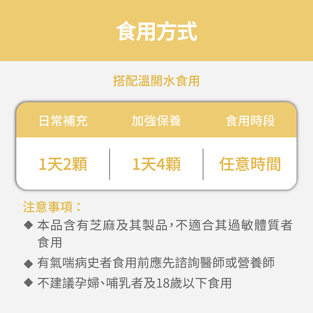 ➤ 每日2-4顆,任一時間搭配溫開水食用