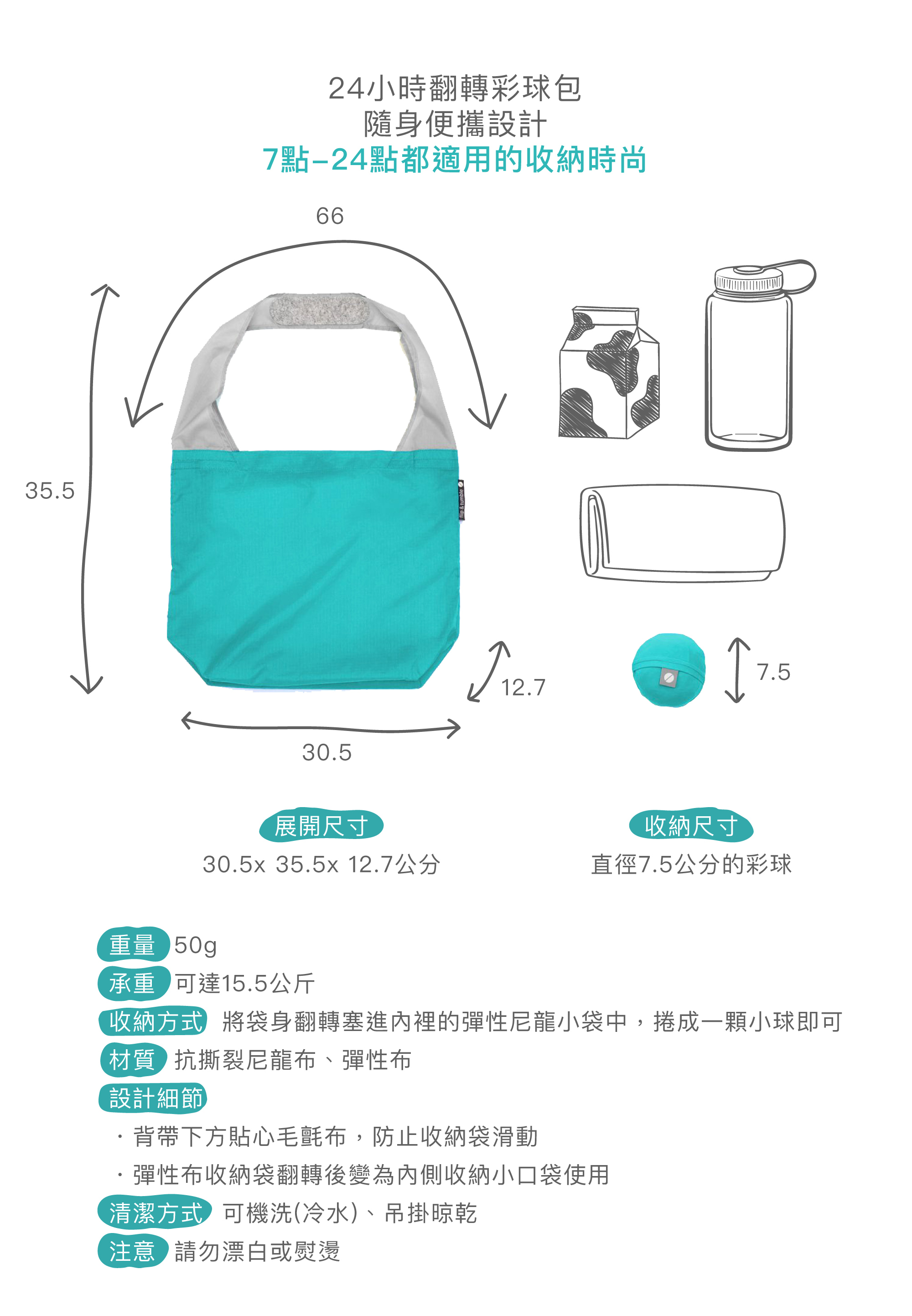 美國 flip & tumble 24小時翻轉球球收納包-- 印花版本只要" 輕鬆翻轉",就能優雅收納!隨身便攜設計加上不同的印花花色,點亮整日好心情!收納極簡、造型極簡,抗撕裂輕量材質 ,50g 超迷你超輕量放在包包裡備用、採購、或出門旅遊 , 24小時都不想離手 ※ 展開尺寸:30.5x 35.5x 12.7公分 ※ 背帶總長66公分 ※ 收納尺寸: 直徑7.5公分的彩球 ※ 重量:50g ※ 承重 :可達15.5公斤※收納方式:將袋身翻轉塞進內裡的彈性尼龍小袋中,捲成一顆小球即可※ 材質 - 抗撕裂尼龍布、彈性布 ※ 設計細節:,背帶下方貼心毛氈布,防止收納袋滑動,彈性布收納袋翻轉後變為內側收納小口袋使用※ 清潔方式:可機洗(冷水),吊掛晾乾。請勿漂白或熨燙