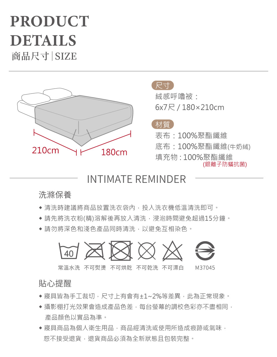 .材質: 上表布:100%聚酯纖維 .下表布:100%聚酯纖維(牛奶絨) .填充物:100%聚酯纖維(銀離子防蟎抗菌)