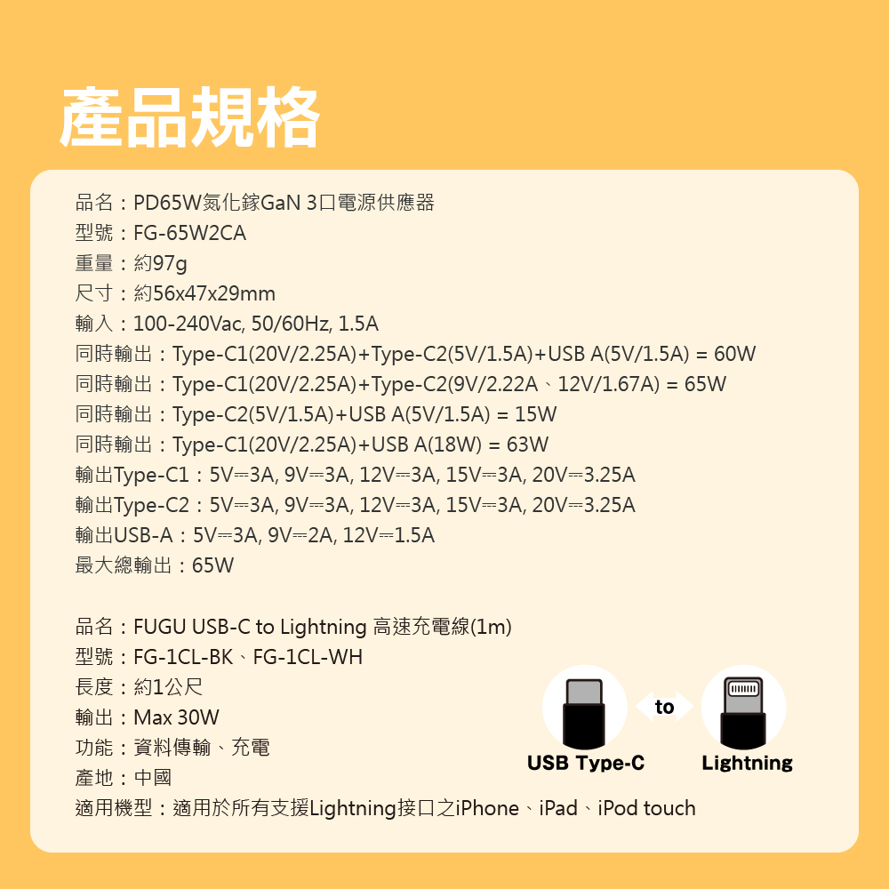 PD65W GaN 3-Port Power Adapter (BSMI Certified) – Includes 1m C to Lightning Charging Cable
