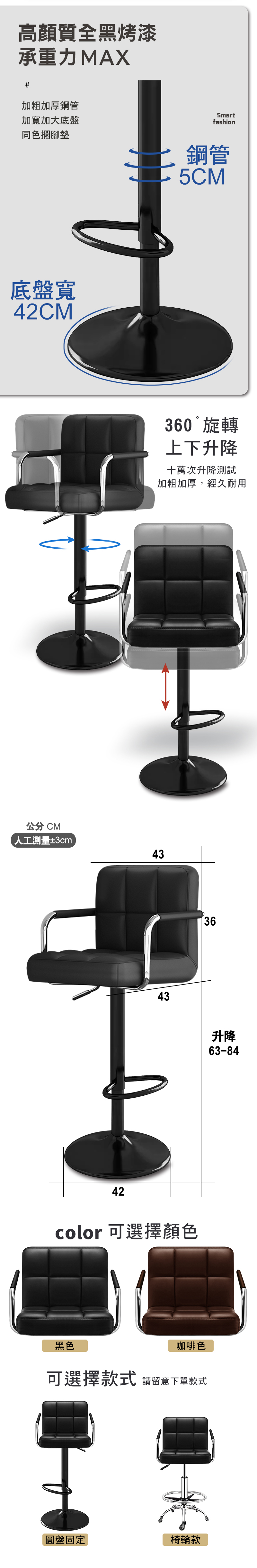 材質:坐布-PU皮革 包覆海綿;支架-電鍍金屬組裝方式:無需組裝、拆封可用乘載重量:靜壓200公斤±3%產地:中國椅輪款式:圓盤加粗鋼管(合金鋼電著黑)◆注意事項:商品尺寸顏色以實際貨品為準。離島及偏遠山區地區,暫無運送服務,敬請見諒!