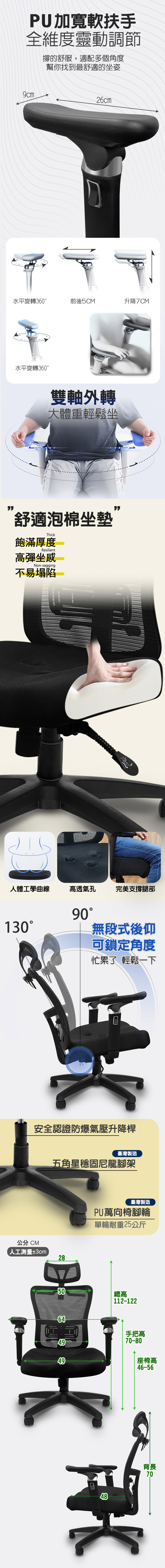 配置: 椅背-彈性透氣網布 坐墊-彈性網布(PU泡棉) 腳架-尼龍五爪腳架 椅輪-全黑帶亮圈(雙輪單軸承含飾蓋) 材質:彈性透氣網布、PU扶手、尼龍 組裝方式:無須組裝、拆封可用 乘載重量:靜壓約100公斤 尺寸:詳情請見商品內文圖 產地:台灣 注意事項: ◆大約1~3個工作天內送貨到府(不含假日)。 ◆購買時請注意商品尺寸大小測量是否合適您的辦公空間再進行下單,避免一切退換貨之手續影響您的權益。 ◆簽收商品前,請先留意貨物是否完整,若有明顯破損損壞等狀況,不簽收並拒收;若已簽收不拆包裹拍照保留狀況聯繫客服處理相關事宜。 ◆辦理退貨商品必須是全新狀態且包裝完整,商品退回若包裝不完整造成運送損傷將會影響你退貨權限,請特別注意。 ◆賣場商品圖因電腦螢幕設定差異會略有不同,請以實品顏色為準,敬請見諒! ◆商品皆由台灣師傅手工製作範圍稍差距為正常。 ◆商品免組裝,拆封即可使用,滾輪也是裝好的,運送過程中會因推椅子上下貨車滑動而沾上灰塵是正常的,並非瑕疵品!只要擦拭過就沒問題喔! ◆貨運認定之困難配送區域(山區、鄉鎮、所有公家機關、學校、醫院、百貨公司、世貿中心、服務區),不做配送;貨下一樓,不做上樓層等附加運送。"有配送地點疑慮,建議下單前與客服聯繫確認"