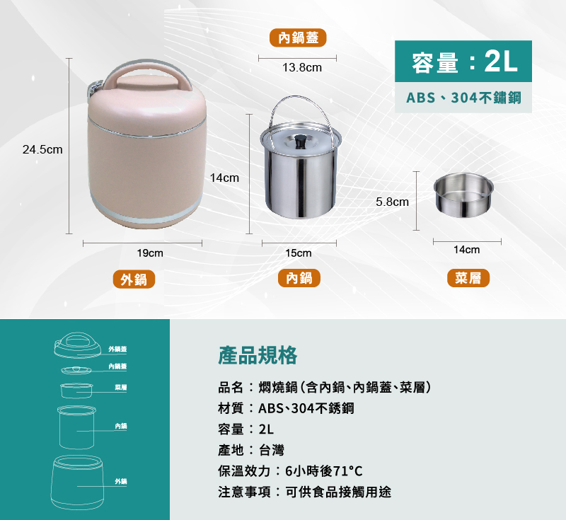 材質:ABS、304不鏽鋼保溫效力:6小時後 63℃尺寸外鍋19cm*19cm*H24.5cm內鍋 15cm*15cm*H14cm內鍋蓋直徑 13.8cm菜層 14cm*14cm*H5.8cm容量 2L