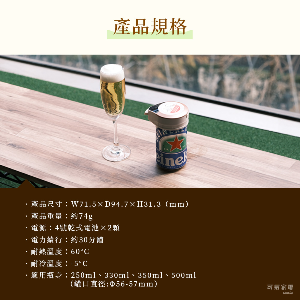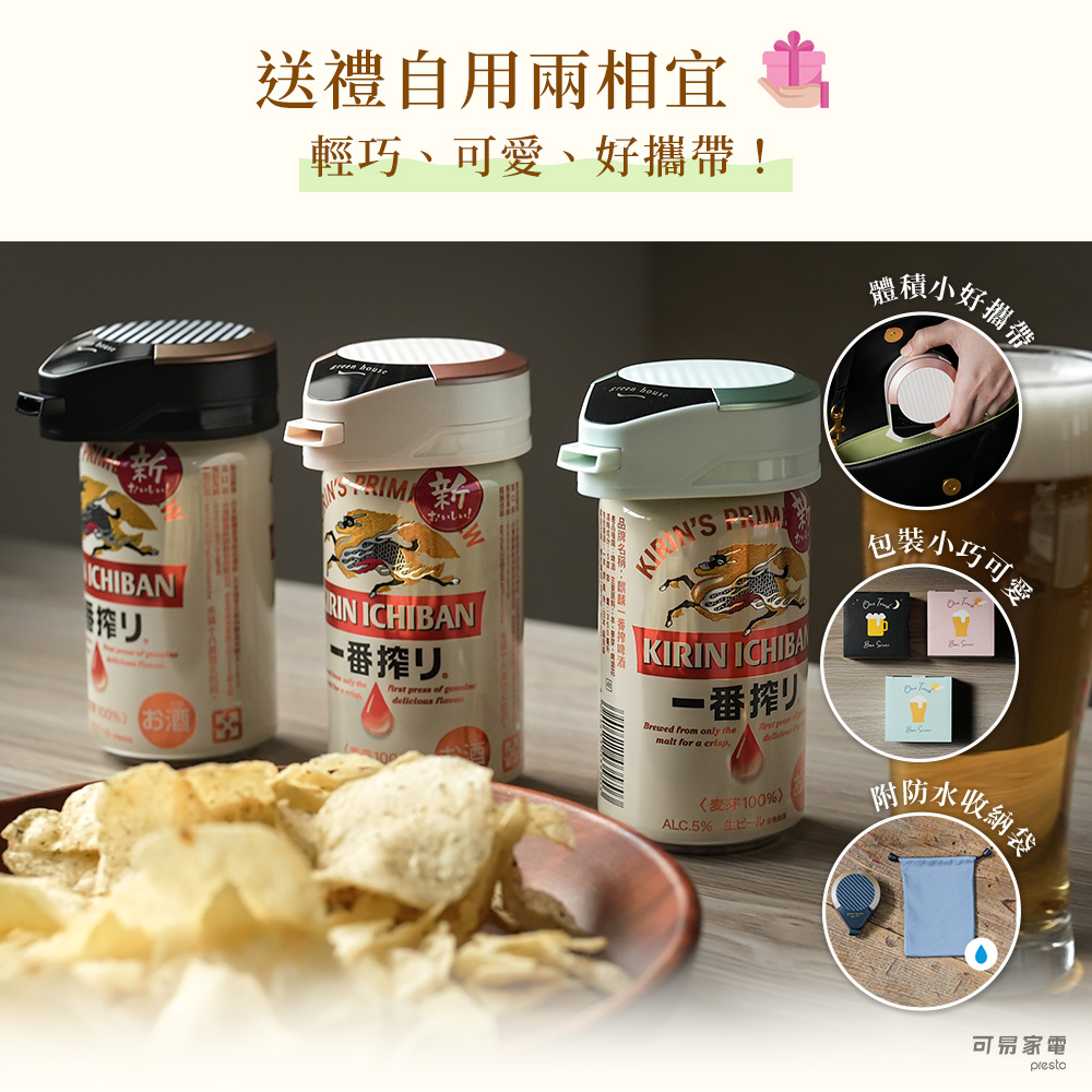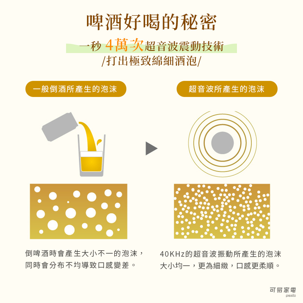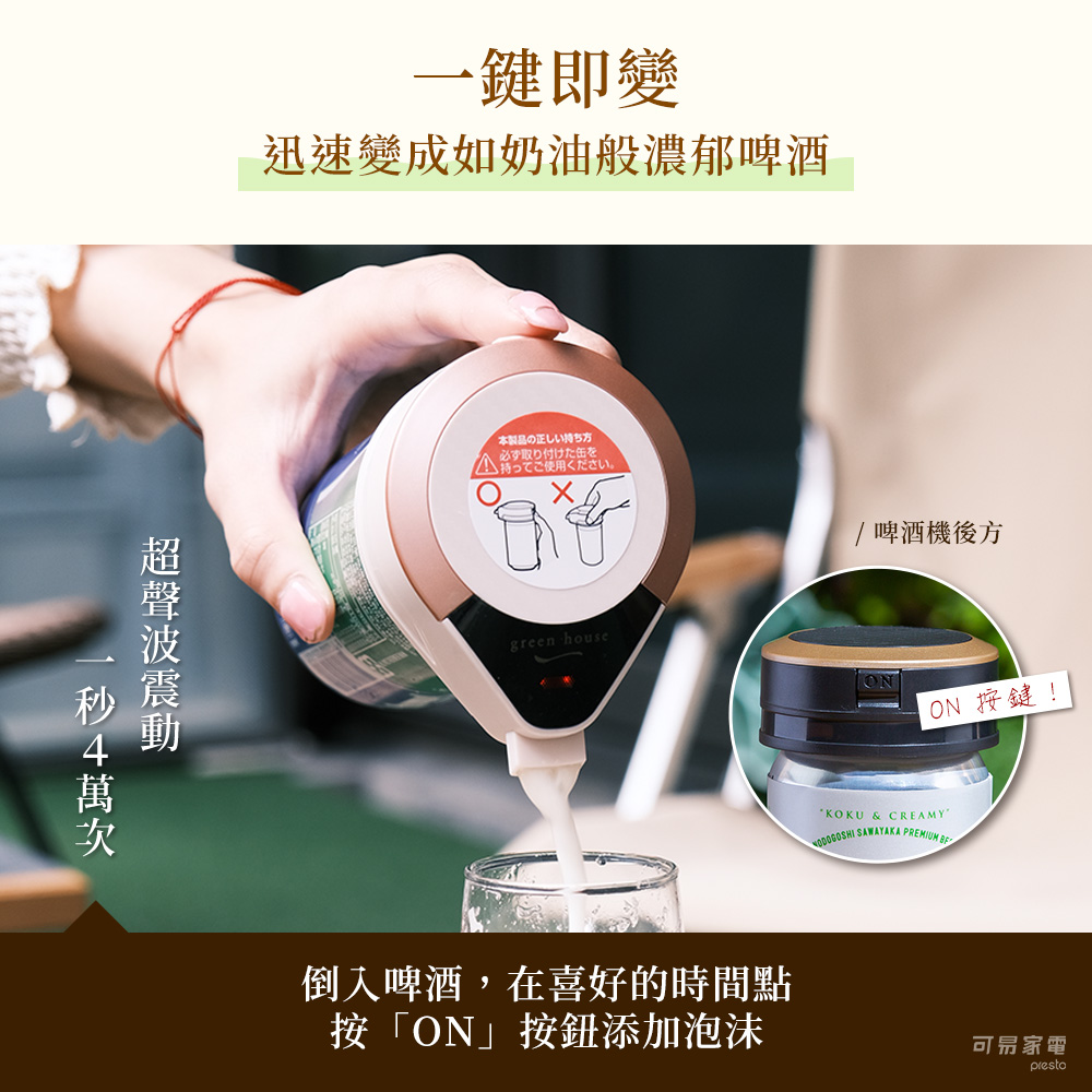 【商品特色】● 一秒 4 萬次超音波振動技術,打出極致綿密酒泡● 隨時喝的到 7 : 3 黃金比例生啤口感啤酒● 送禮自用兩相宜● 輕巧可愛好攜帶