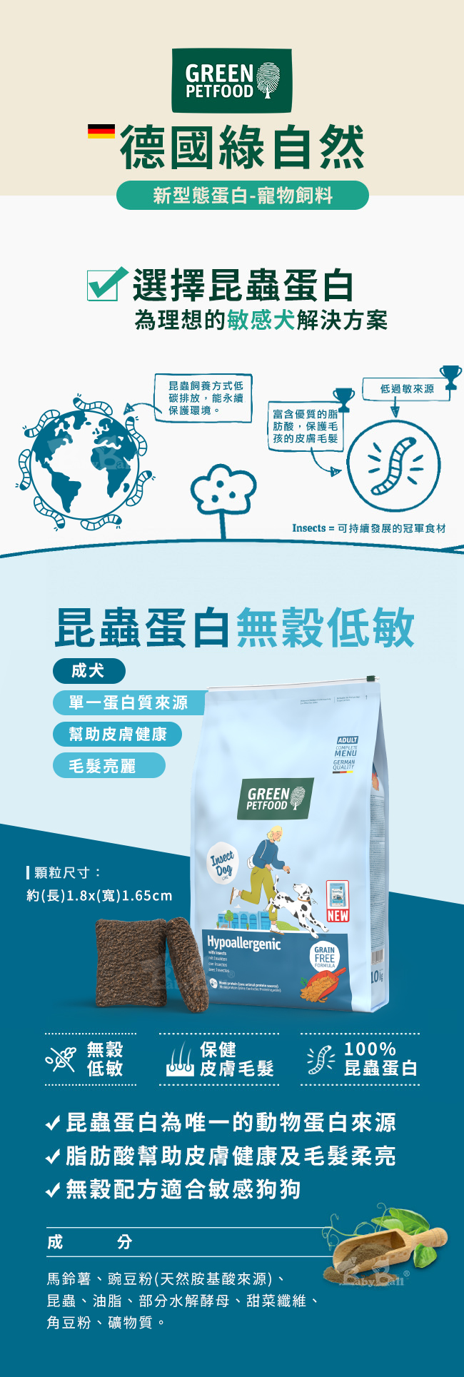 【成分】 馬鈴薯、豌豆粉(天然胺基酸來源)、昆蟲10%、油脂、部分水解酵母、甜菜纖維、角豆粉、礦物質。