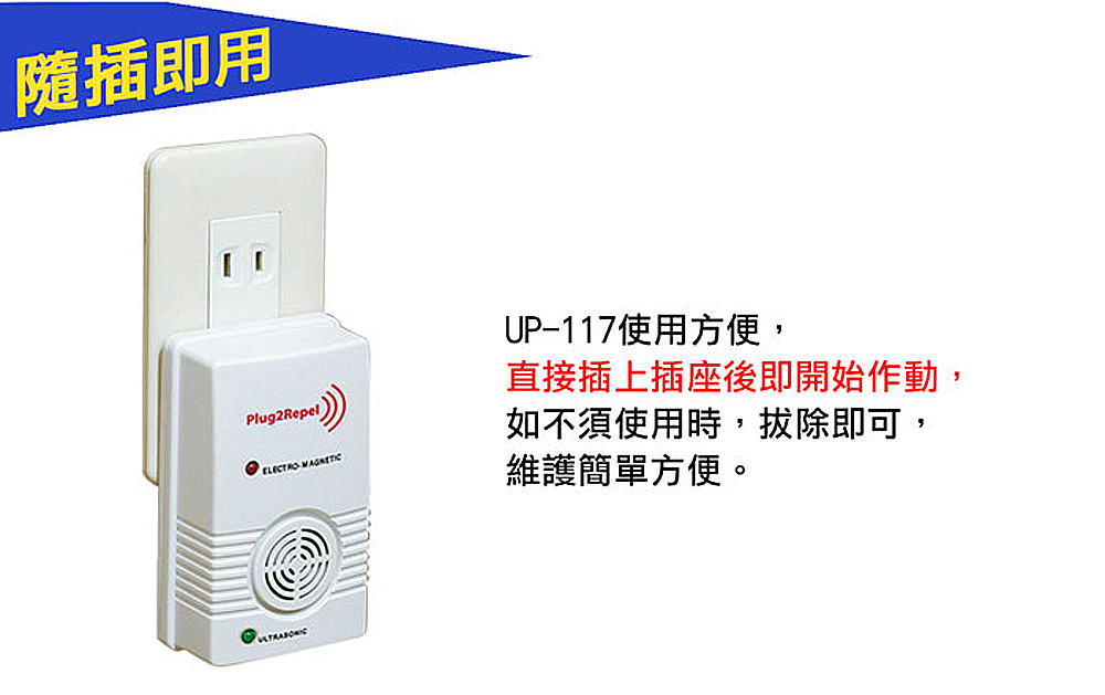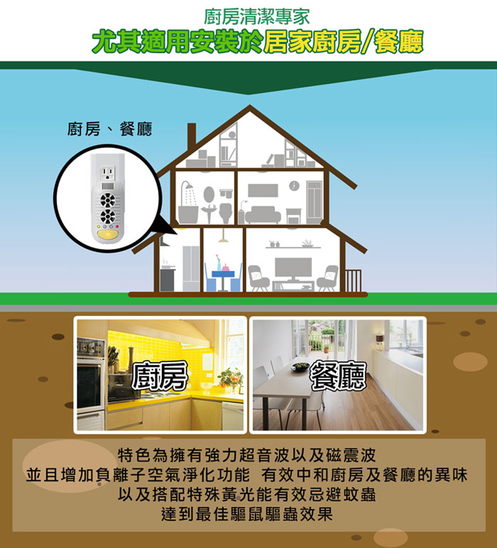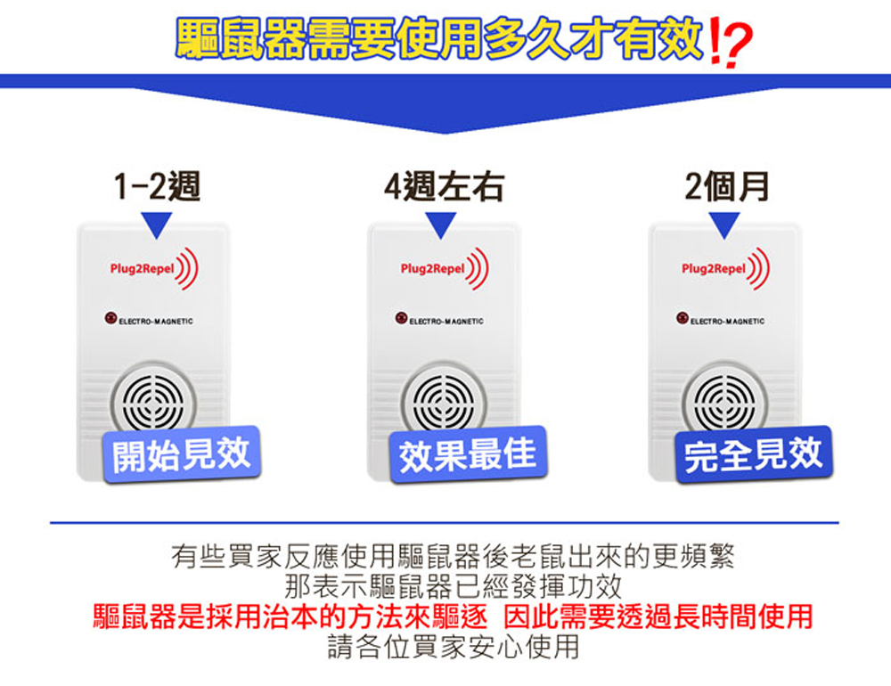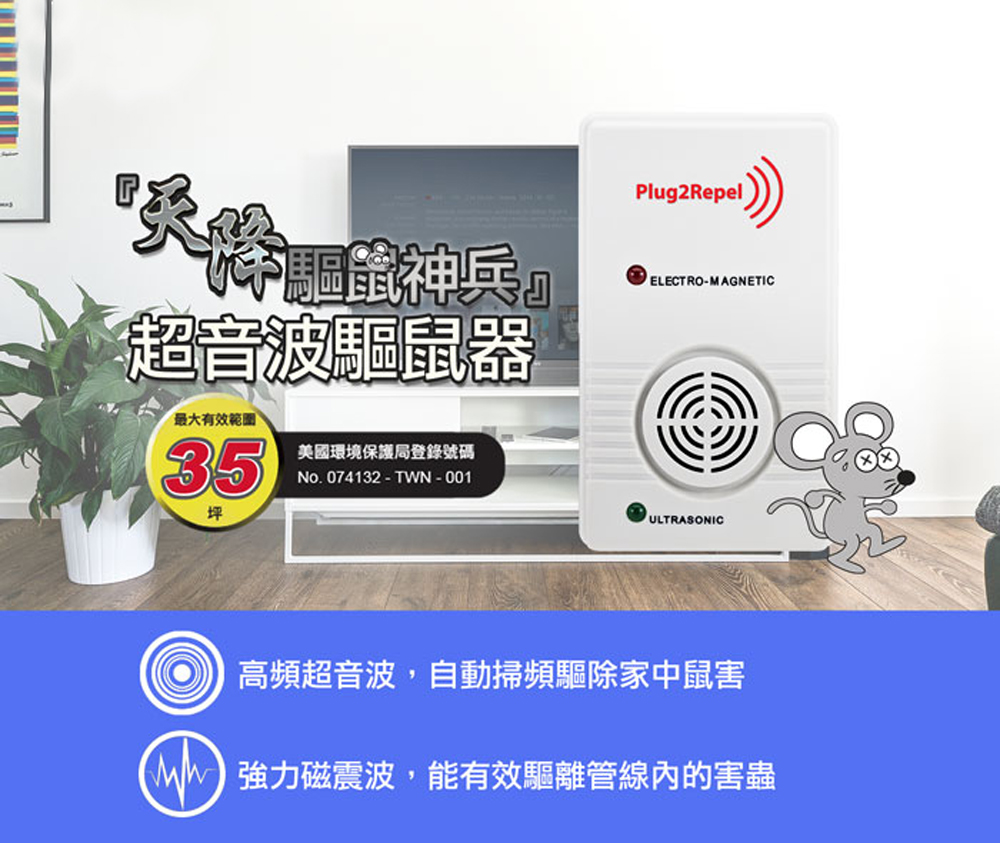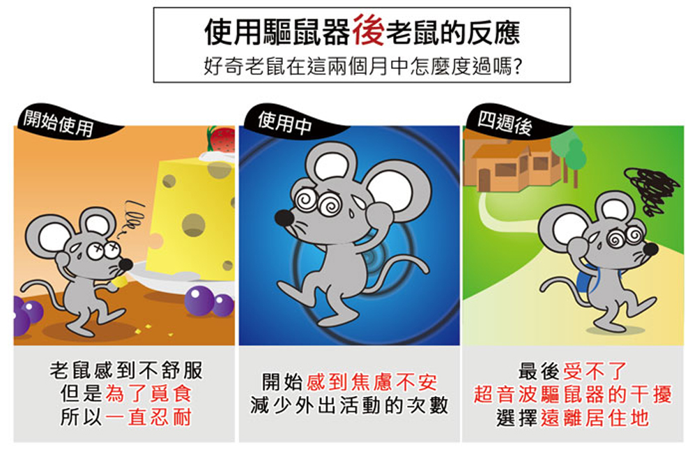 ※ 使用本產品亦須配合打理居家環境,減少害鼠蟲可以躲藏的空間,並斷絕食物的供應,害鼠與害蟲將因驅鼠器的雙重強力驅逐加上食物缺乏而加速離開長期賴以維的環境,達到快速驅逐的效果