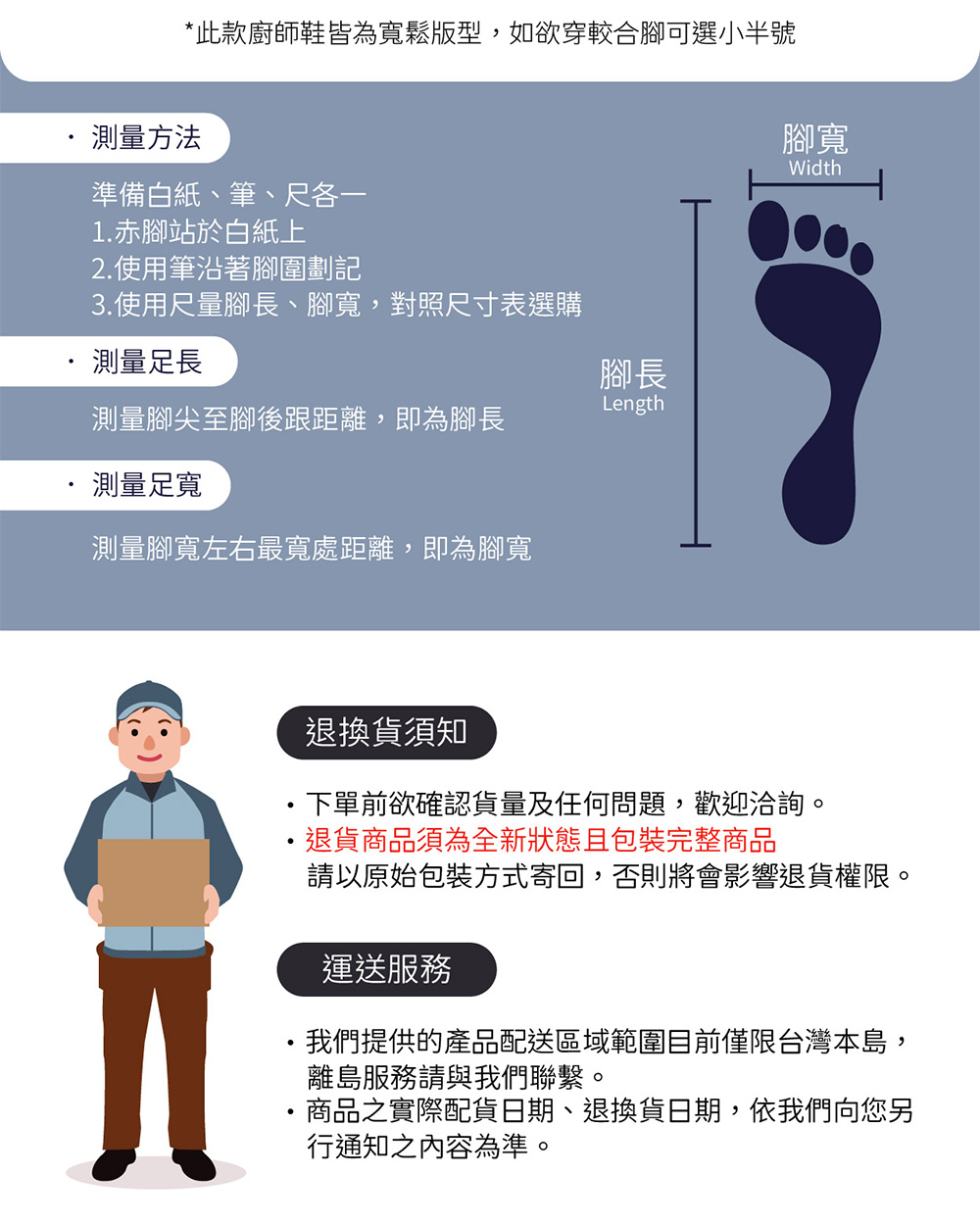 產品:MIT防水一體成型廚師鞋工作鞋拖鞋 5003黑黃男女款(黃LOGO)穿著輕便又舒適一體成型.不脫膠.不怕溼廚房、戶外、雨天/防水防滑活動式鞋墊可清洗 .清潔又衛生材質:PVC聚氯乙烯產地:台灣本產品符合標準測試規範CNS 15138/CNS 14940/CNS 4797-2/CNS 15204不含:回塑劑/游離甲醛/重金屬/偶氮染料【鑑賞期及退貨注意事項】1.提供15天鑑賞期之權益(含例假日,此為考慮期並非試用期),不可適用於以下情況,如留有污漬、磨損、有異味、配件不全,商品經拆封或使用以致缺乏完整性即失去再販售價值時,恕無法退貨。2.退貨商品須為全新狀態且包裝完整商品,請以原始包裝方式寄回,包含完整無損之外箱、商品、包裝紙,目錄、吊牌、贈品、配件等,若原外箱已遺失,請另使用紙箱包覆於商品原廠包裝外,切勿直接於原包裝上黏貼紙張或書寫文字,來做寄送,若原盒內所有物品有損壞或遺失,恕不接受退貨。3.請注意,以下情況無法受理退貨:●鞋底磨損,或皮底產生刮痕。(請於室內,軟墊上試穿SIZE)●鞋面上有不可清除之髒污。●鞋頭已經楦過、鞋面出現明顯摺痕。●鞋子附屬配件已使用或短缺。因上述的這些情形,會造成該鞋品因為無法再拿來販售的情形而無法退貨,若您試穿後有不合意的地方請您特別注意以上事項。寄回物品時,請在鞋盒外另加包裝,請勿在鞋盒上黏貼膠帶或宅配單,若造成鞋盒損壞恕不接受退換喔4.下單前欲確認貨量及任何問題歡迎使用聊聊洽詢。
