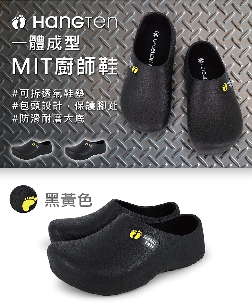 HANG TEN 廚師鞋 工作鞋 拖鞋 懶人鞋 男鞋 女鞋 MIT台灣製 防水 減壓 透氣 散熱 排汗 耐磨 防滑 黑黃