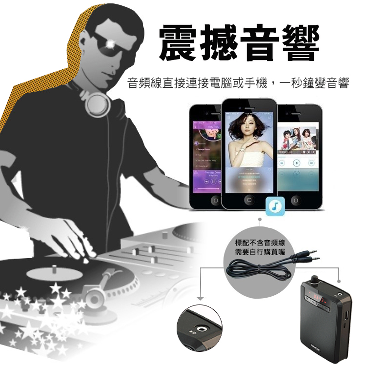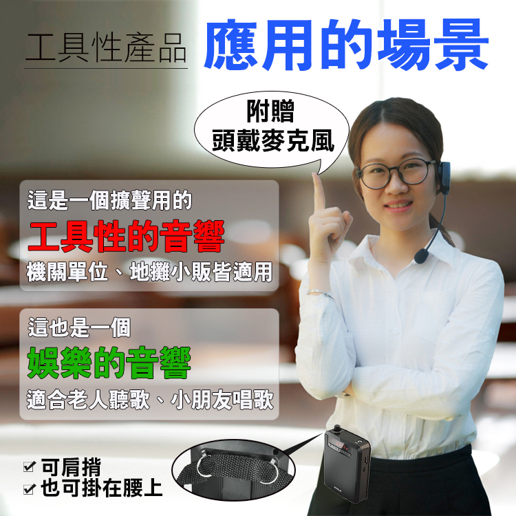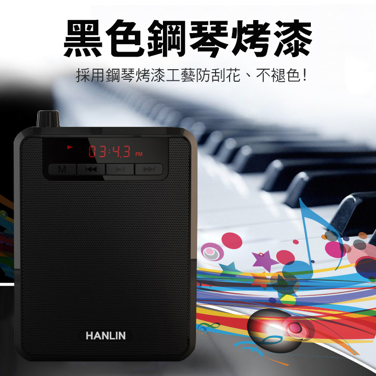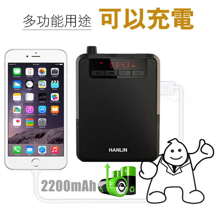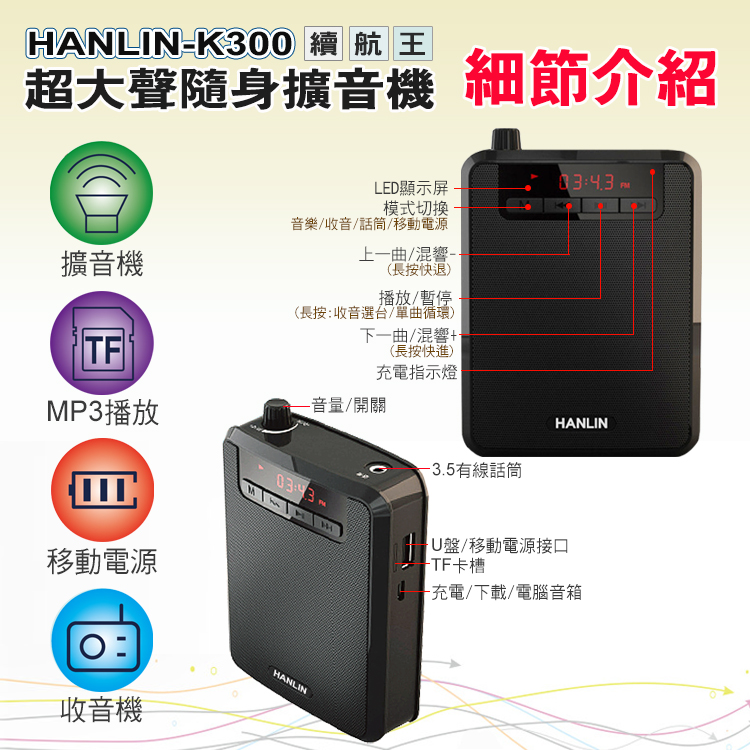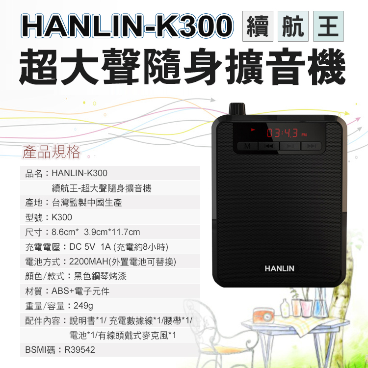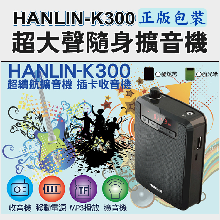 HANLIN-K300 續航王-超大聲隨身擴音機(最高達125分貝)產品特點:1.超大聲的大聲公!!2.支援TF插卡播放 最大支援32G(建議用C10)3.支援USB直接讀取4.透過數據線連接 轉成PC模式 變成電腦播放喇叭5.可拆式充電鋰電池 6.可腰掛也可背7.超長續航力,單純擴音使用可達約8~15小時(依音量不同有所不同)8.音樂播放可達約3~8小時(依音量不同有所不同)9.收音機功能FM頻道10.液晶螢幕顯示 提示狀態11.話筒麥克風3.5mm插孔 附贈頭戴麥克風使用~講課最方便!!最愛族群: 領隊導遊 / 老師教學 / 夜市叫賣 / 長輩用收音機 / 街舞音樂播放 / 辦公族 / 工人工地■品名:HANLIN-K300 續航王-超大聲隨身擴音機■產地:台灣監製中國生產■型號:K300■尺寸:8.6cm x 3.9cm x 11.7cm■充電電壓:DC 5V 1A (充電約8小時)■電池方式 :2200MAH(外置電池可替換)■顏色/款式:黑色鋼琴烤漆■材質:ABS+電子元件■重量/容量:249g■配件內容:說明書x1/ 充電數據線x1/腰帶x1/電池x1/有線頭戴式麥克風x1■BSMI碼 : R39542注意事項1. 請在常溫環境中存放及使用產品2. 請勿將本產品曝露在雨中或潮濕環境中3. 請勿丟擲,避免因跌落造成產品損壞4. 請勿自行拆解、修理和改造本產品5. 長時間不使用,請取出記憶卡6. 產品內置電池,請勿隨意丟棄或置於火中,以免引起危險