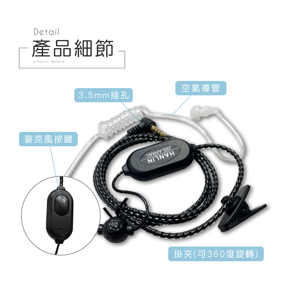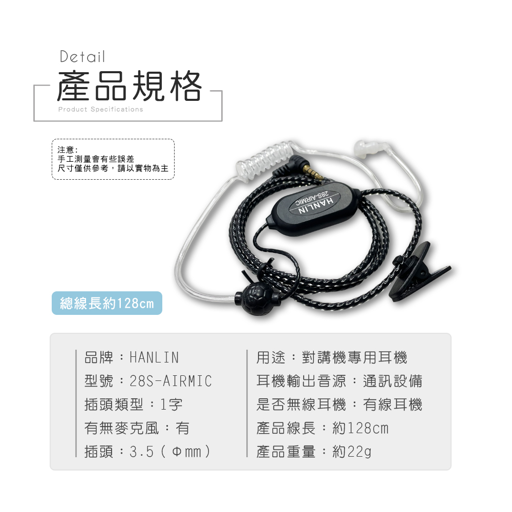[HANLIN]-28S-AIRMIC (適用TLK28S對講機) 空氣導管3.5mm麥克風耳機 #對講機專用 #3.5mm插頭