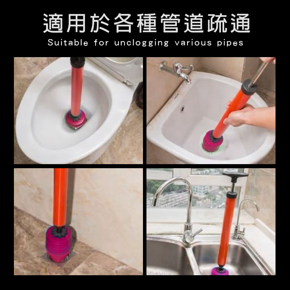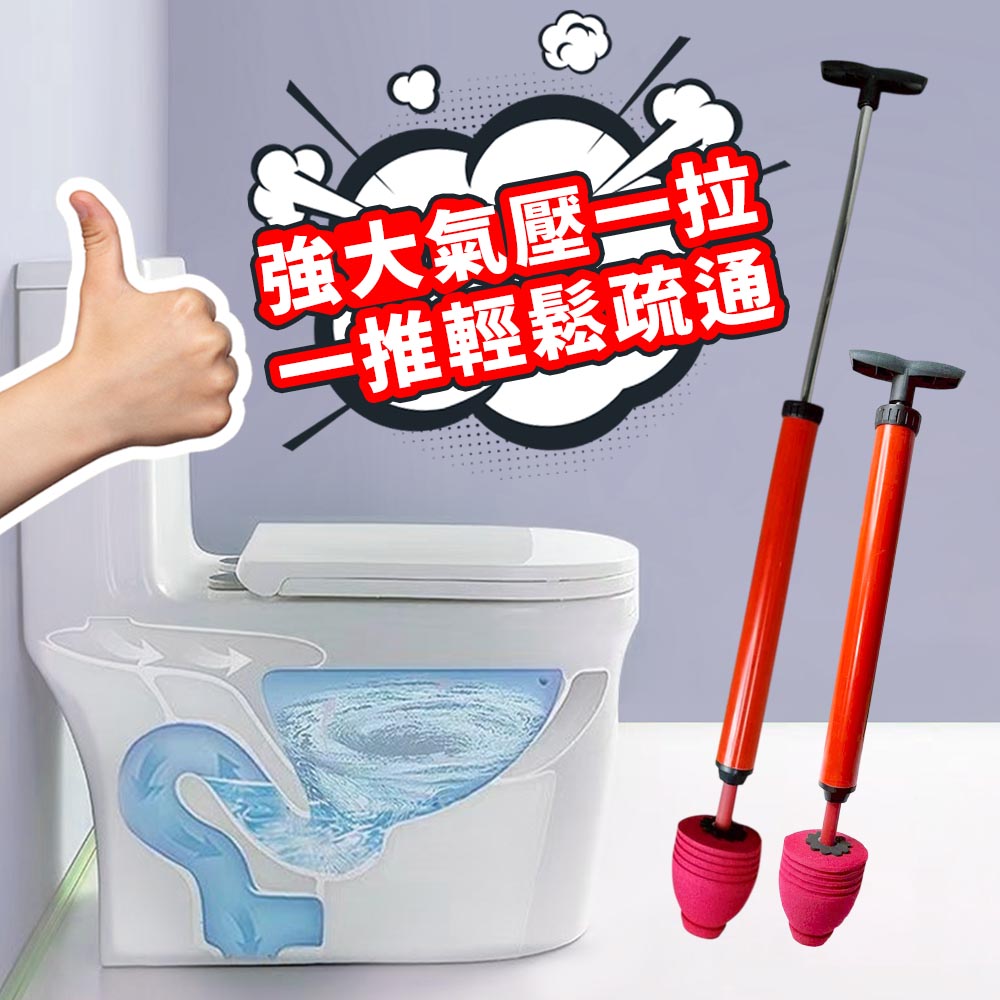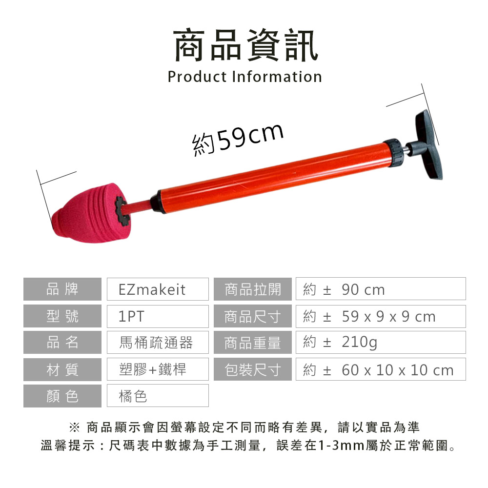 EZmakeit-1PT 馬桶疏通器 強大氣壓 一拉一推 輕鬆疏通 打氣一炮通 水管疏通器 強力高壓 馬桶 水槽 地漏 排水管 下水道 疏通神器 【產品特點】●直沖馬桶疏通●虹吸式馬桶疏通●排水管疏通●洗臉池疏通●洗菜池疏通●地漏疏通●水槽疏通<<不同空間,一支在廁所,一支在廚房,家中必備兩支更安心>>【產品規格】品牌:EZmakeit 型號:1PT品名:馬桶疏通器材質:塑膠+鐵桿顏色:橘色商品拉開:約 ± 90 cm商品尺寸:約 ± 59 x 9 x 9 cm商品重量:約 ± 210g包裝尺寸:約 ± 60 x 10 x 10 cm【注意事項】※所有商品皆為手工測量,尺寸可能有1~3mm誤差。※顏色可能因拍照光線、螢幕不同等原因, 導致可能會有色差。 一切以實物為主。※避免高溫、潮濕或強磁場環境。【使用方法】●直沖馬桶 :準備舊毛巾與熟料帶,將毛巾與塑膠袋同時捆綁在堵頭上(需捆綁)在出氣孔出大洞,留出氣孔包裹後的堵頭可以完全堵住馬桶口即可。●虹吸式馬桶 :將堵頭用勁塞緊馬桶口,馬桶內注水淹沒堵頭並沒有冒泡即可,推動打氣4-5下即可,打氣時確保管道內滿水,如果水不是很滿可以拔出堵頭再次注水。●排水管道 :適用管徑約3.5~7.5cm的管道;管道內要有水,沒有水請加滿;將密封頭塞入下水管口;快速打氣五下左右;拔出密封頭,向管道內繼續加滿水;重複以上步驟1-5次。●洗臉池&洗菜池 :管道内要有水,沒有水請加滿;將密封頭塞入下水口;密封好管道口與密封頭周圍;快速打氣五下左右;拔出密封頭,向管道內繼續加滿水;重複以上步驟1-5次。●地漏&下水管 :疏通地漏或下水道前提要確保上面的蓋子能夠掀開,否則不能疏通;管道内要有水,沒有水請加滿將密封頭塞入下水道口;快速打氣五下左右;拔出密封頭,向管道內繼續加滿水重複以上步驟1-5次即可。