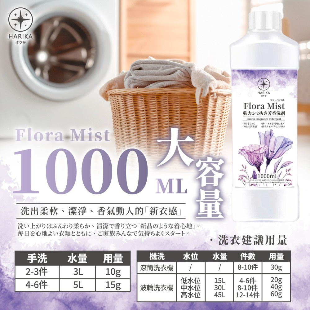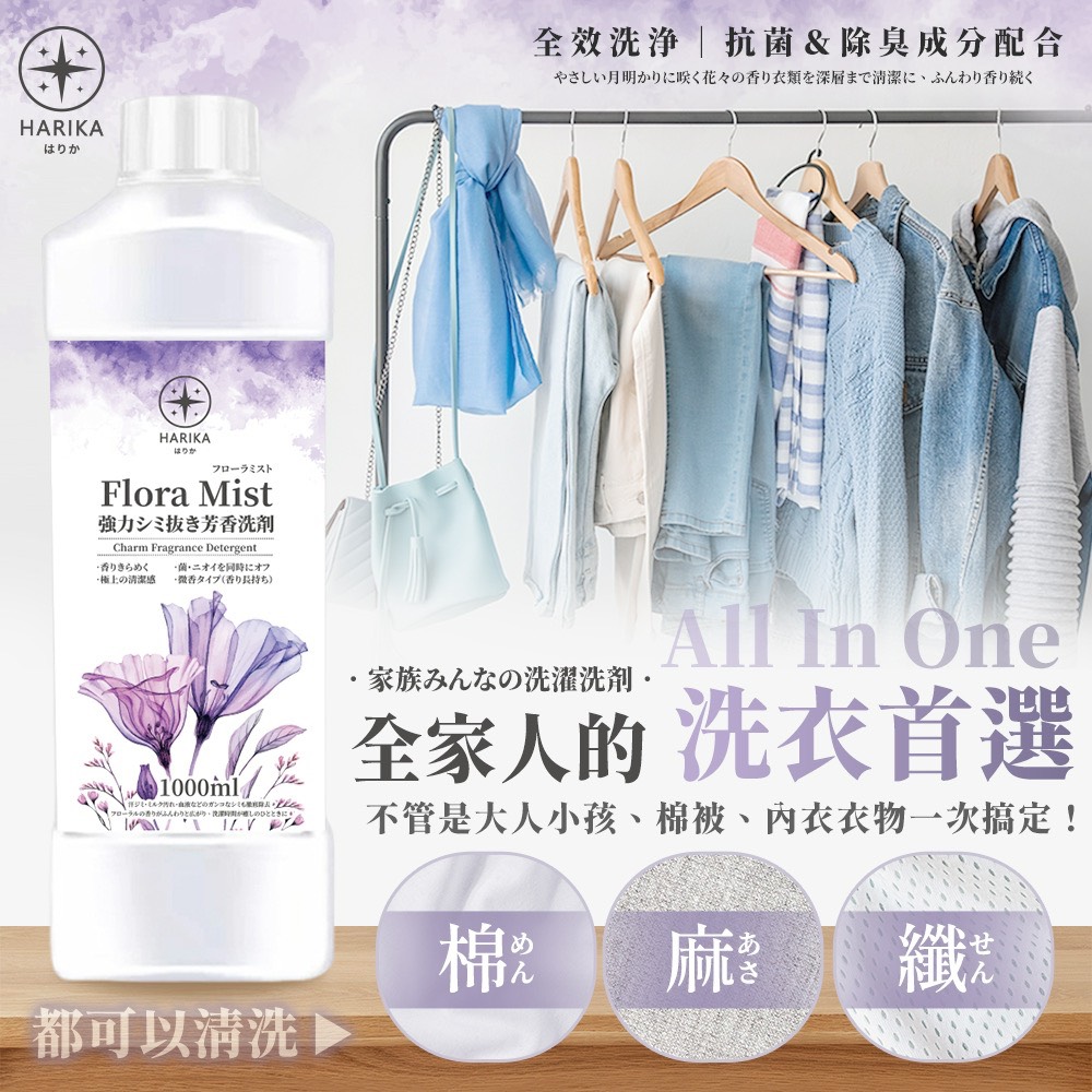 洗淨+長效留香一次搞定!超強去污力,油漬汗漬一沖即淨長效留香,淡雅花香清新持久適用多種材質,一罐解決全家需求 品名:Flora Mist 全效去污香氛洗衣精
