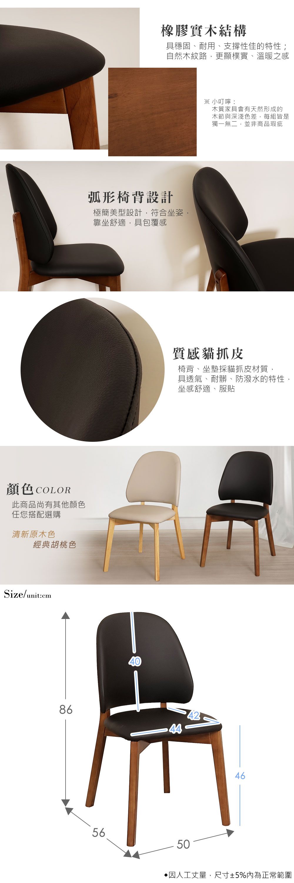 ◆實木材質結構,穩固耐用◆耐磨貓抓皮坐墊,舒適好坐◆弧形包覆椅背設計,靠坐好舒適◆免自行組裝,專人配送到府整體配件:餐椅 x 2入尺寸:寬 50 x 深 56 x 高86 公分材質:橡膠木、貓抓皮顏色:胡桃色產地:中國誤差值:因人工丈量,尺寸±5%內為正常範圍