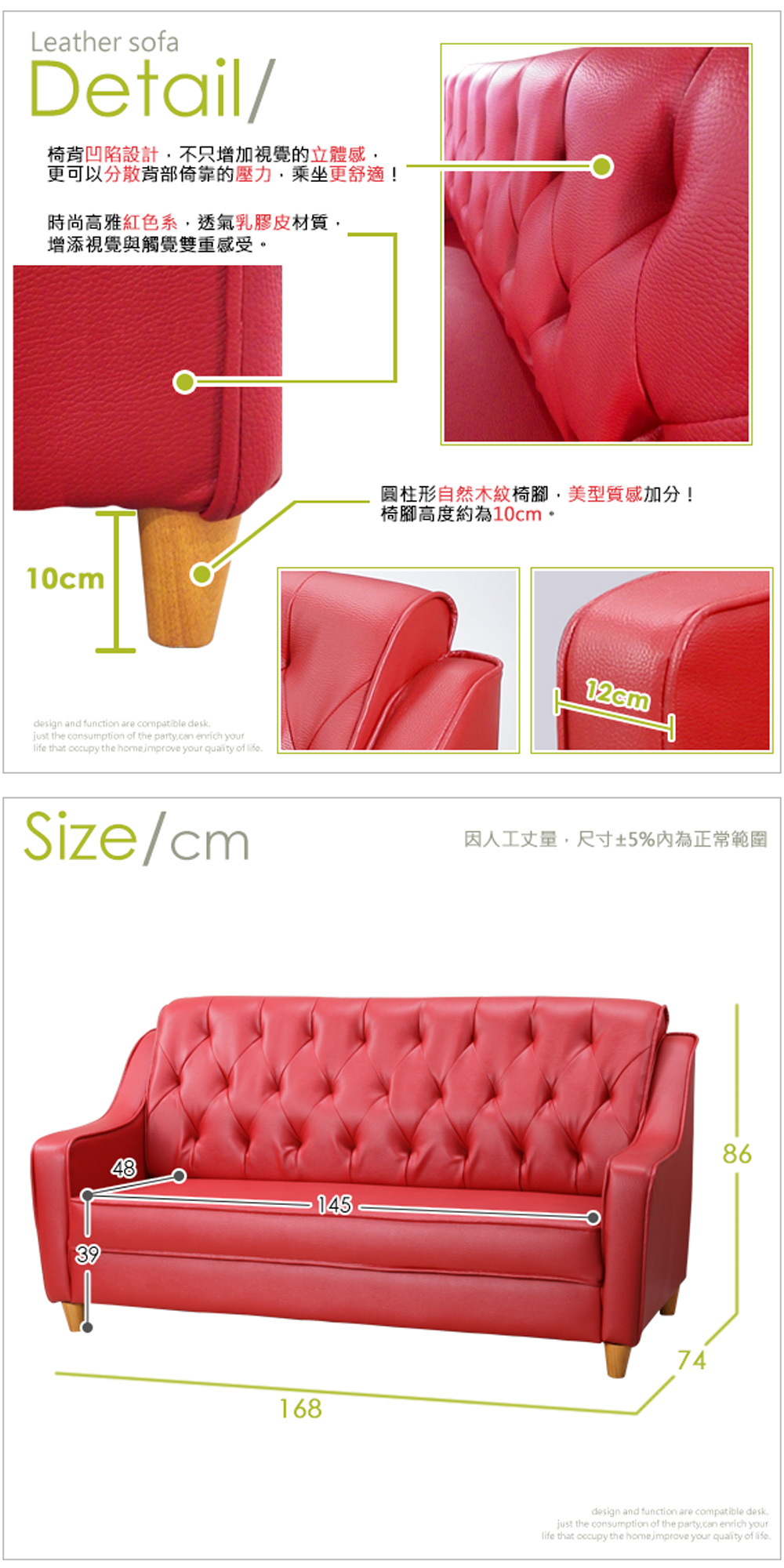 ◆乳膠皮好保養,透氣度更佳!◆實木材質椅腳,穩固又大方!◆專人免運配送,貼心到府安裝◆容易清潔,支撐性較強的坐感◆寬敞客廳的三人沙發◆喜氣洋洋的艷紅色沙發尺寸─ 寬168 x 深74 x 高86 cm座深 48 cm x 座高 39 cm顏色─ 艷紅色材質─ 透氣乳膠皮、高密度泡棉產地─ 台灣誤差值─ 因人工丈量,尺寸±5%內為正常範圍