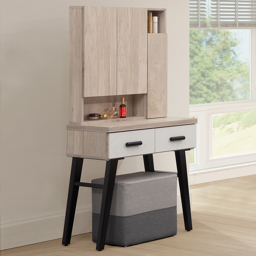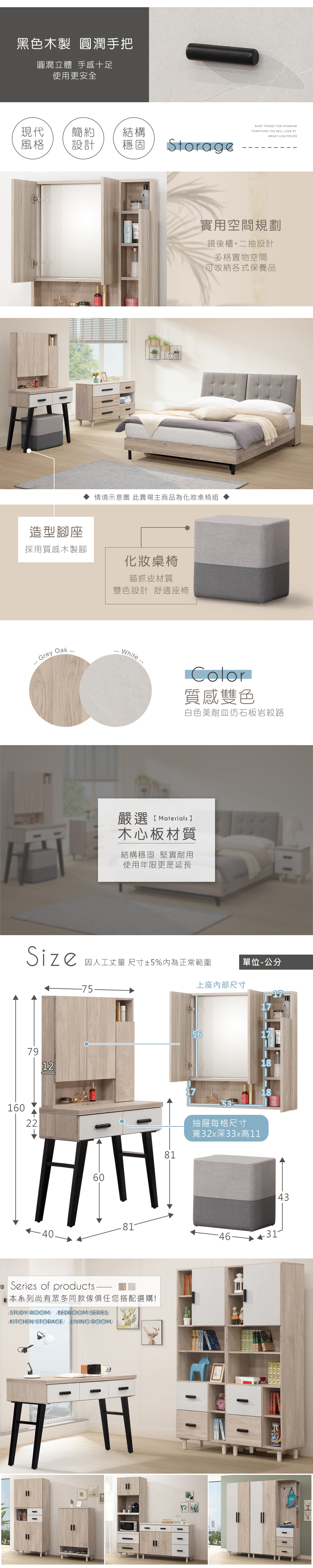 化妝桌尺寸:寬 81 x 深 40 x 高 160 公分化妝椅尺寸:寬 43 x 深 31 x 高 43 公分材質:高級木心板、美耐皿顏色:灰橡+白產地:台灣誤差值:因人工丈量,尺寸±5%內為正常範圍