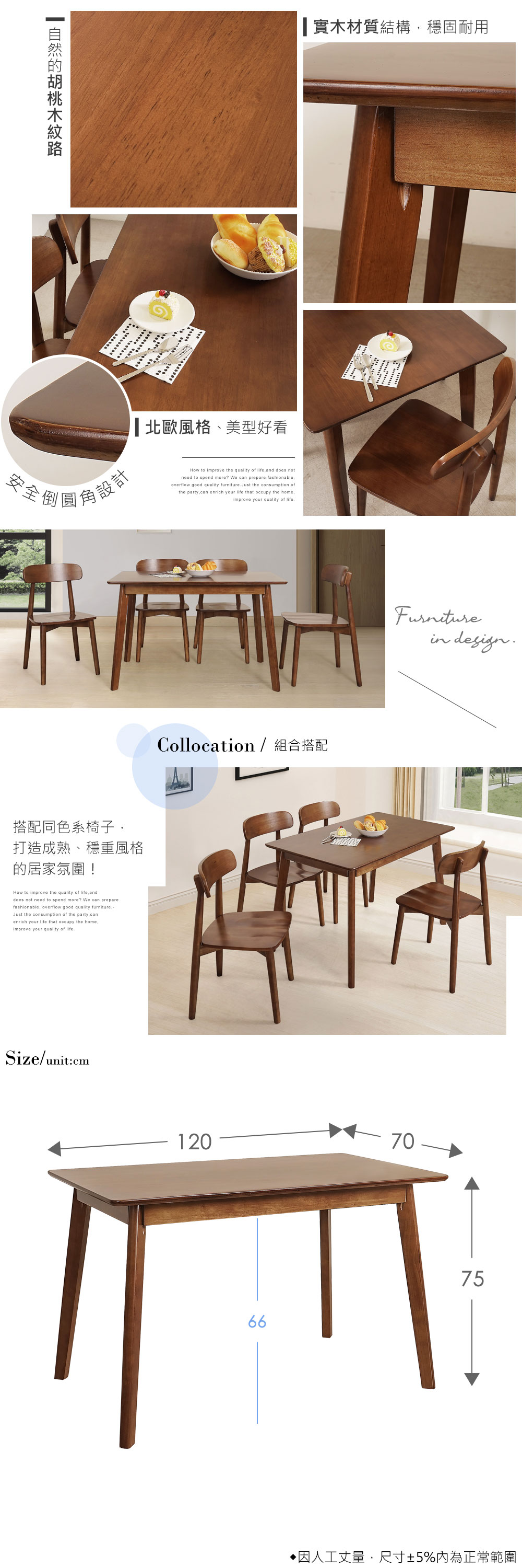 ◆實木材質結構,穩固耐用◆北歐風簡約餐桌,美型好搭◆經典、沉穩的胡桃木紋肌理◆免自行組裝,專人配送到府尺寸:寬 120 x 深 70 x 高 75 公分材質:橡膠木顏色:胡桃色產地:中國誤差值:因人工丈量,尺寸±5%內為正常範圍