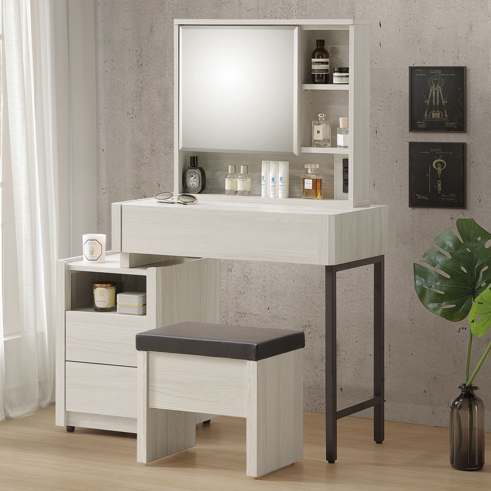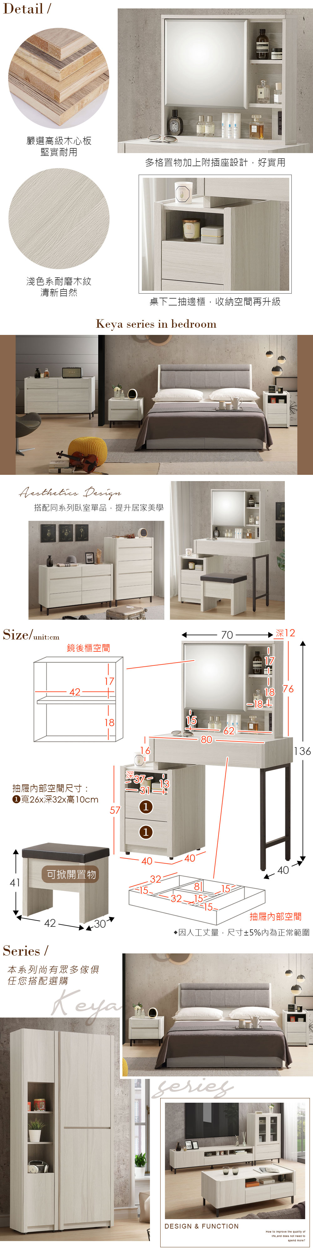 ◆木心板材質,堅實、穩固、耐用◆清新淺色系,質感木紋路視覺◆鏡後櫃設計,可以擺放化妝品、保養品瓶罐◆多格抽屜空間規劃,收納分類好整齊◆附安全、合格認證的插座延長線◆化妝椅可掀開置物,收納空間再升級◆免組裝,專人配送到府化妝桌尺寸:寬 80~113 x 深 40 x 高 136 公分化妝椅尺寸:寬 43 x 深 30 x 高 41 公分材質:高級木心板、鐵腳顏色:白榆木色產地:台灣誤差值:因人工丈量,尺寸±5%內為正常範圍