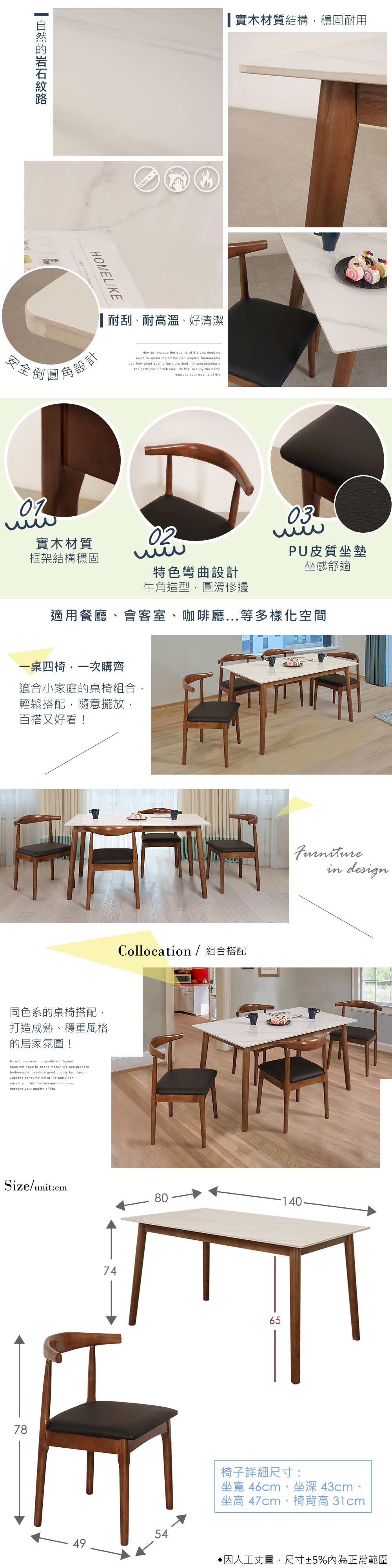 ◆岩板耐刮、耐高溫、好清潔◆實木材質結構,穩固耐用◆北歐風格設計,美型好搭◆一桌四椅,一次購齊◆免自行組裝,專人配送到府整體配件:餐桌 x 1 + 餐椅 x 4桌子尺寸:寬 140 x 深 80 x 高 74 公分椅子尺寸:寬 54 x 深 49 x 高 78 公分桌子材質:橡膠木、岩板椅子材質:橡膠木、PU皮面顏色:胡桃色產地:中國誤差值:因人工丈量,尺寸±5%內為正常範圍