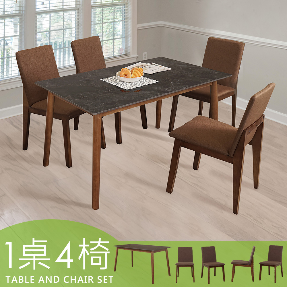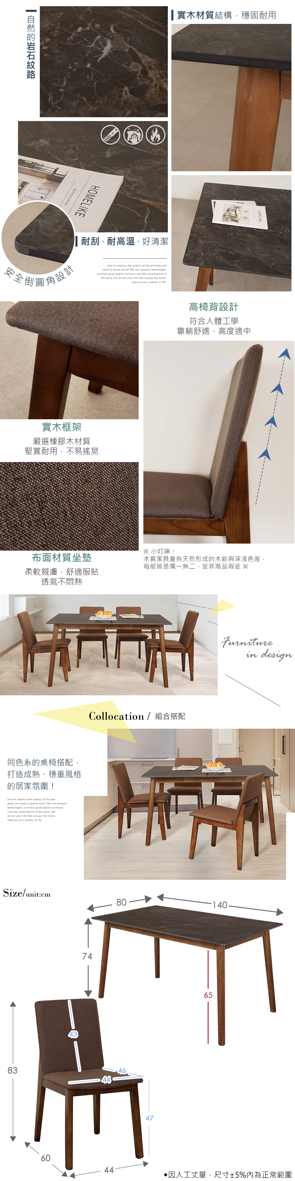 ◆岩板耐刮、耐高溫、好清潔◆實木材質結構,穩固耐用◆北歐風格設計,美型好搭◆一桌四椅,一次購齊◆免自行組裝,專人配送到府整體配件:餐桌 x 1 + 餐椅 x 4桌子尺寸:寬 140 x 深 80 x 高 74 公分椅子尺寸:寬 44 x 深 60 x 高 83 公分桌子材質:橡膠木、岩板椅子材質:橡膠木、布面顏色:胡桃色產地:中國誤差值:因人工丈量,尺寸±5%內為正常範圍