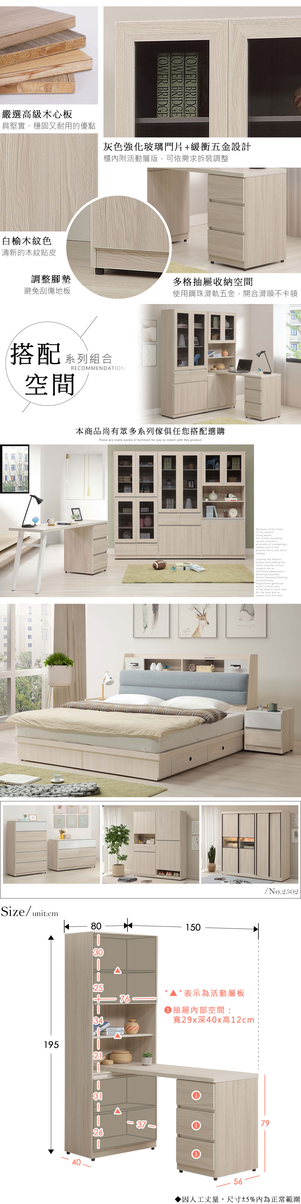 尺寸:寬 80 x 深 150 x 高 195 公分材質:高級木心板、美耐皿、強化玻璃顏色:白榆木雙色產地:台灣誤差值:因人工丈量,尺寸±5%內為正常範圍