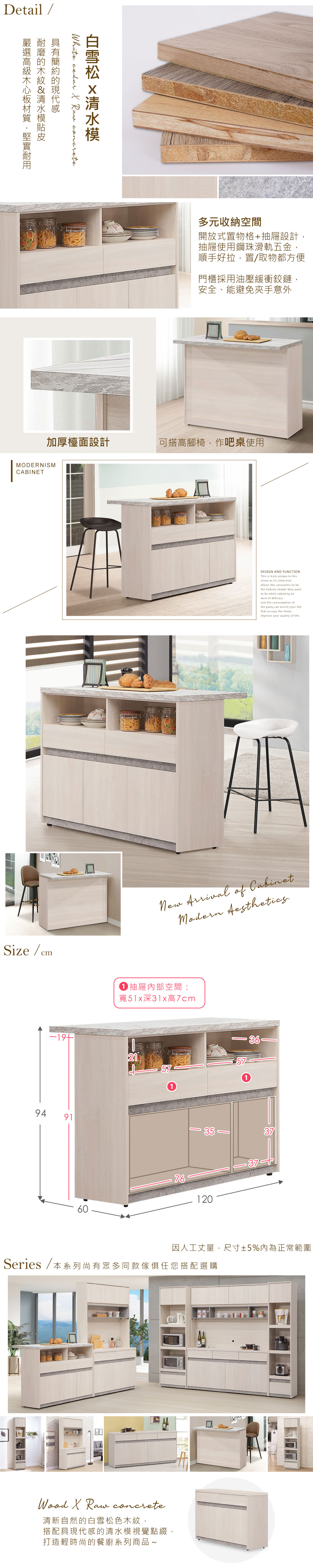 ◆清新木紋x清水模拼色◆嚴選高級的木心板材質◆內縮設計,可作吧桌使用◆免組裝,專人配送到府◆鋼刷耐磨貼皮,視覺觸感佳◆門片緩衝設計,抽屜鋼珠滑軌輕鬆開闔◆二抽屜+門片收納空間◆可當中島桌、吧台桌、餐桌、多功能桌、輕料理桌、餐櫃尺寸:寬 120 x 深 60 x 高 94 公分材質:高級木心板顏色:白雪松+清水模產地:台灣誤差值:因人工丈量,尺寸±5%內為正常範圍